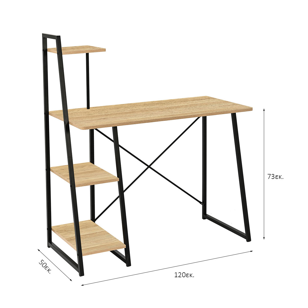 Γραφείο υπολογιστή με μοντέρνο σχεδιασμό. Η επάνω επιφάνεια είναι κατασκευασμένη από μελαμίνη πάχους 1.5cm σε απόχρωση δρυός (Oak) και έχει μαύρο μεταλλικό σκελετό με ηλεκτροστατική βαφή. Διαθέτει 3 ράφια που χρησιμεύουν για βιβλία, γραφική ύλη ή ό,τι άλλο θέλετε αν έχετε κοντά στον υπολογιστή. Τα πόδια του γραφείου διαθέτουν τάπες για να μην φθείρουν το πάτωμα. Συνδυάστε το με τα υπόλοιπα είδη του ίδιου σετ για ένα ολοκληρωμένο αποτέλεσμα.*Το προϊόν έρχεται αμοντάριστο και συναρμολογείται βάσει οδηγιών.*