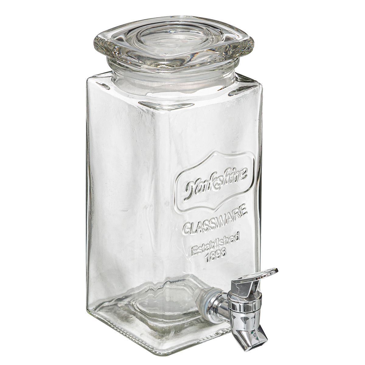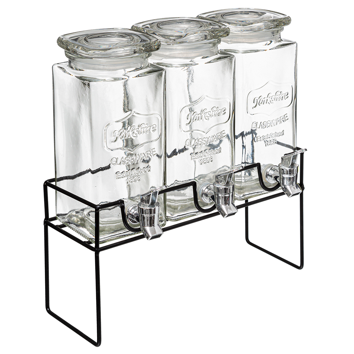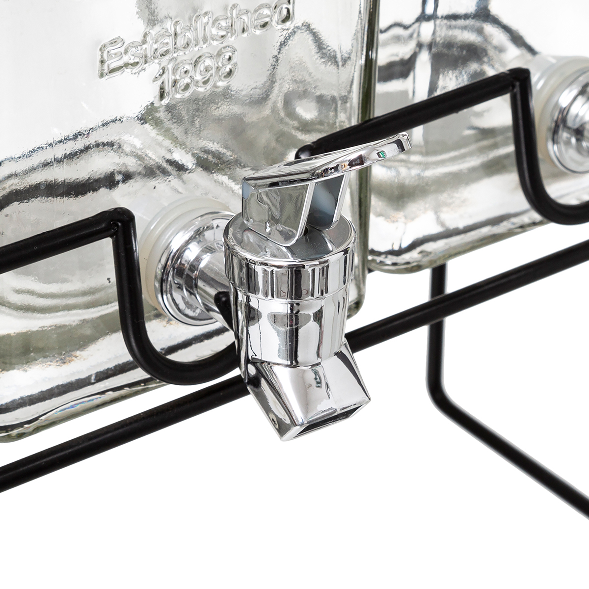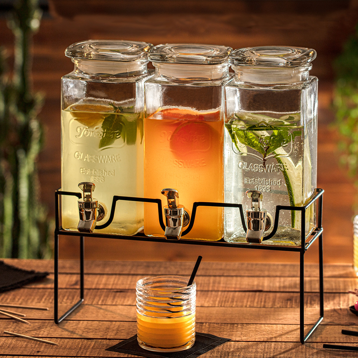 Γυάλινα δοχεία με βρυσάκι 3 τεμάχια σε σταντ. Τα δοχεία είναι κατασκευασμένα από διάφανο γυαλί, ενώ η βάση είναι μαύρη μεταλλική. Είναι ένα πρακτικό και κομψό σετ, το οποίο μπορεί να χρησιμοποιηθεί για την διανομή ποτών σε κοινωνικές εκδηλώσεις, γιορτές, ή άλλα δείπνα. Το βρυσάκι βοηθά στην εξυπηρέτηση μεγάλων ποσοτήτων υγρών, όπως νερό, χυμούς, ποτά ή κρύες σούπες. Χωρητικότητας ανά δοχείο 1500ml.