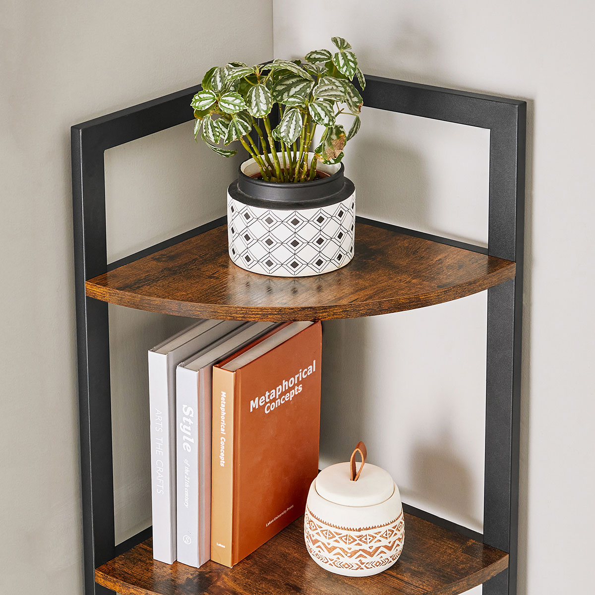 Επιδαπέδια γωνιακή ραφιέρα 5 θέσεων από την εταιρεία Vasagle. Είναι κατασκευασμένη από μοριοσανίδα σε καφέ ρουστίκ χρώμα και μαύρο μεταλλικό σκελετό. Ιδανική για να τοποθετηθεί σε οποιοδήποτε μέρος του σπιτιού όπως στο μπάνιο ή στο σαλόνι για να δώσει ένα μοντέρνο ύφος, τακτοποιώντας παράλληλα τα μικροπράγματα σας, τα βιβλία σας ή ό,τι άλλο θέλετε. Διαθέτει 4 πόδια τα οποία έχουν τάπες για να μην φθείρουν το πάτωμα. Διαθέτει εξαρτήματα εγκατάστασης τοίχου για μέγιστη σταθερότητα. Καθαρίστε με ένα υγρό πανί και έπειτα σκουπίστε. Μέγιστο βάρος αντοχής ανά ράφι: 5kg.*Το προϊόν έρχεται αμοντάριστο και συναρμολογείται βάσει οδηγιών.*