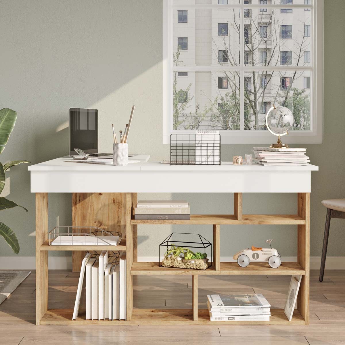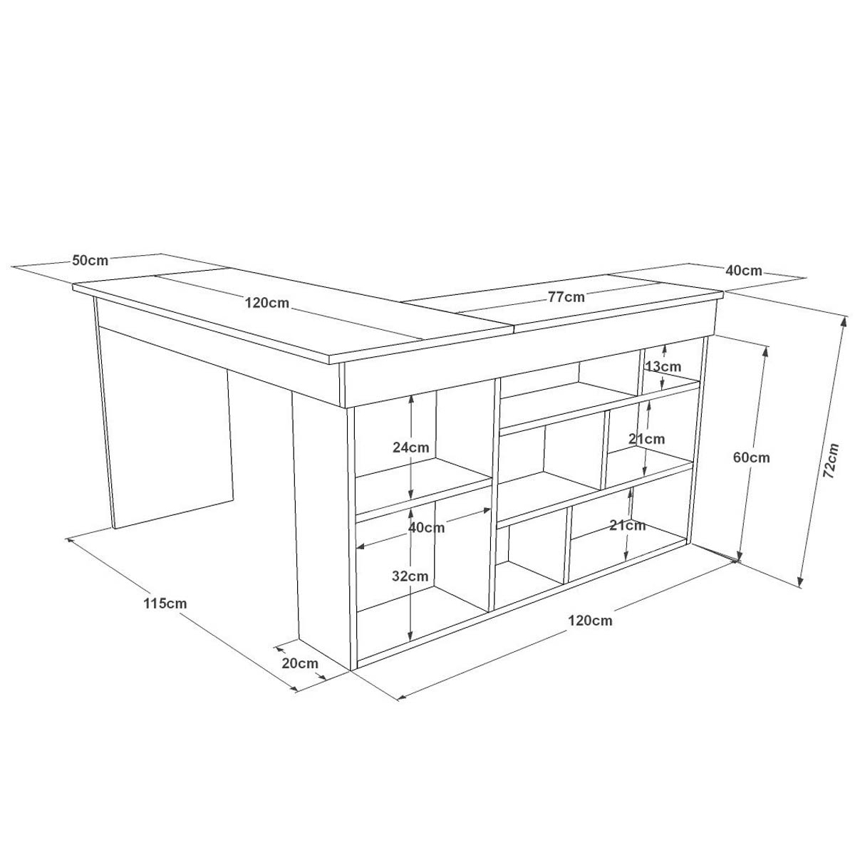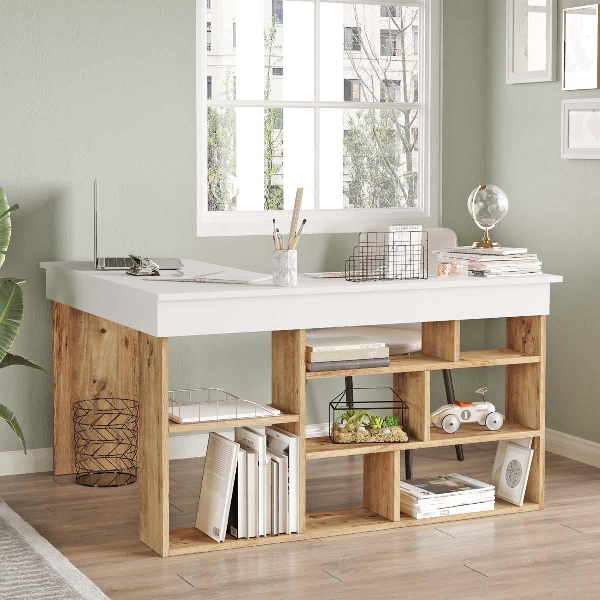 Γωνιακό γραφείο σε φυσική απόχρωση ξύλου και επιφάνεια εργασίας σε λευκό χρώμα με μοντέρνο σχεδιασμό. Η μία μεριά διαθέτει βιβλιοθήκη για επιπλέον αποθηκευτικό χώρο για τα βιβλία, τα περιοδικά ή τα διακοσμητικά σας. Σας προσφέρει εργονομία και λειτουργικότητα δημιουργώντας έναν άνετο χώρο εργασίας. Το προϊόν έρχεται αμοντάριστο και συναρμολογείται βάσει οδηγιών.