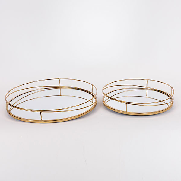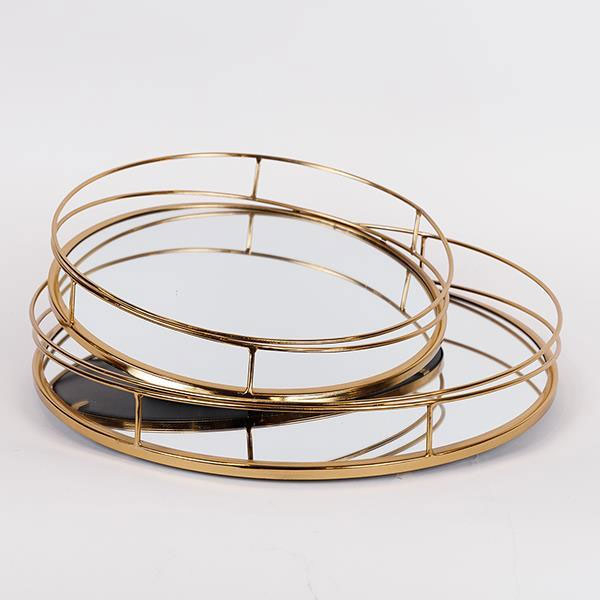 Δίσκοι διακόσμησης σετ από την εταιρεία Estheti σε χρυσό χρώμα με μοντέρνο σχεδιασμό. Ο σκελετός είναι κατασκευασμένος από μεταλλικό υλικό. Η βάση είναι γυάλινος καθρέφτης. Έχουν περιστρεφόμενο πάτο 360°, προσφέροντας εύκολη πρόσβαση σε όλα τα αντικείμενα που τοποθετούνται επάνω. Ιδανικοί για την τραπεζαρία ή το σαλόνι, αυτοί οι δίσκοι μπορούν να χρησιμοποιηθούν για να αναδείξουν τη διακόσμηση του χώρου σας, είτε με την τοποθέτηση μικρών αντικειμένων, είτε ως κεντρικό διακοσμητικό στοιχείο.