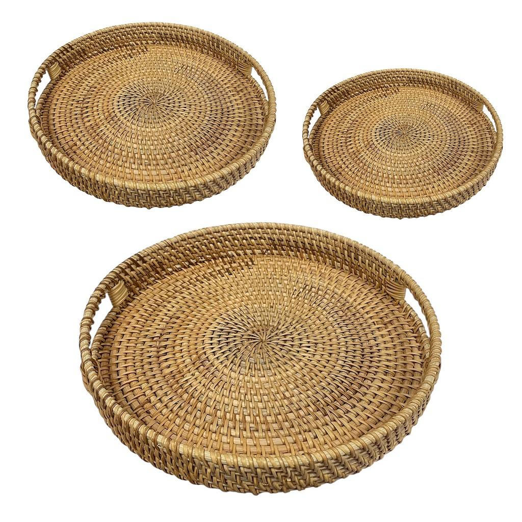 Δίσκοι διακόσμησης από την εταιρεία Espiel με έθνικ ύφος. Είναι κατασκευασμένοι από ρατάν σε φυσική απόχρωση. Ιδανικοί για την τραπεζαρία ή το σαλόνι, αυτοί οι δίσκοι μπορούν να χρησιμοποιηθούν για να αναδείξουν τη διακόσμηση του χώρου σας, είτε με την τοποθέτηση μικρών αντικειμένων, είτε ως κεντρικό διακοσμητικό στοιχείο.