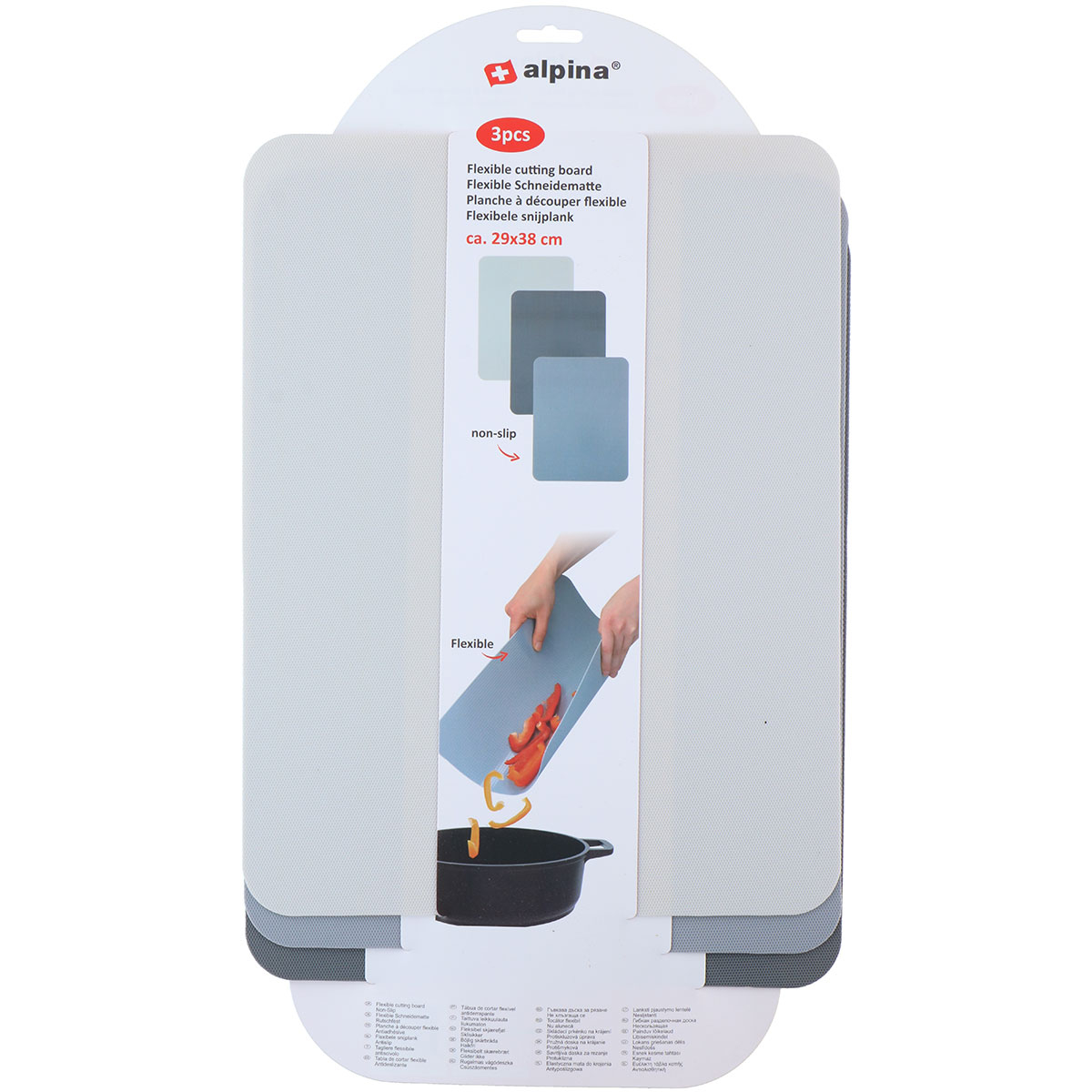 Επιφάνειες κοπής σε ορθογώνιο σχήμα, από την εταιρεία Alpina. Το σετ περιλαμβάνει 3 δίσκους κοπής ίδιου μεγέθους σε γκρι αποχρώσεις κατασκευασμένους από πλαστικό υλικό. Ιδανικές για το κόψιμο του φαγητού που θα κάνει τη διαφορά στην κουζίνα σας.