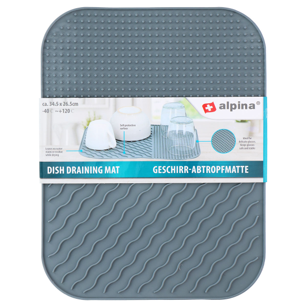 Δίσκος αποστράγγισης από την εταιρία Alpina. Είναι κατασκευασμένος από σιλικόνη σε γκρι απόχρωση, που αποτρέπει την ολίσθηση των αντικειμένων. Το νερό της αποστράγγισης διατρέχει εύκολα προς τον δίσκο χωρίς να αφήνει υγρασία στα πιάτα ή τα ποτήρια χάρις στην ανάγλυφη επιφάνειά του και έτσι τα αντικείμενα στεγνώνουν πιο γρήγορα.