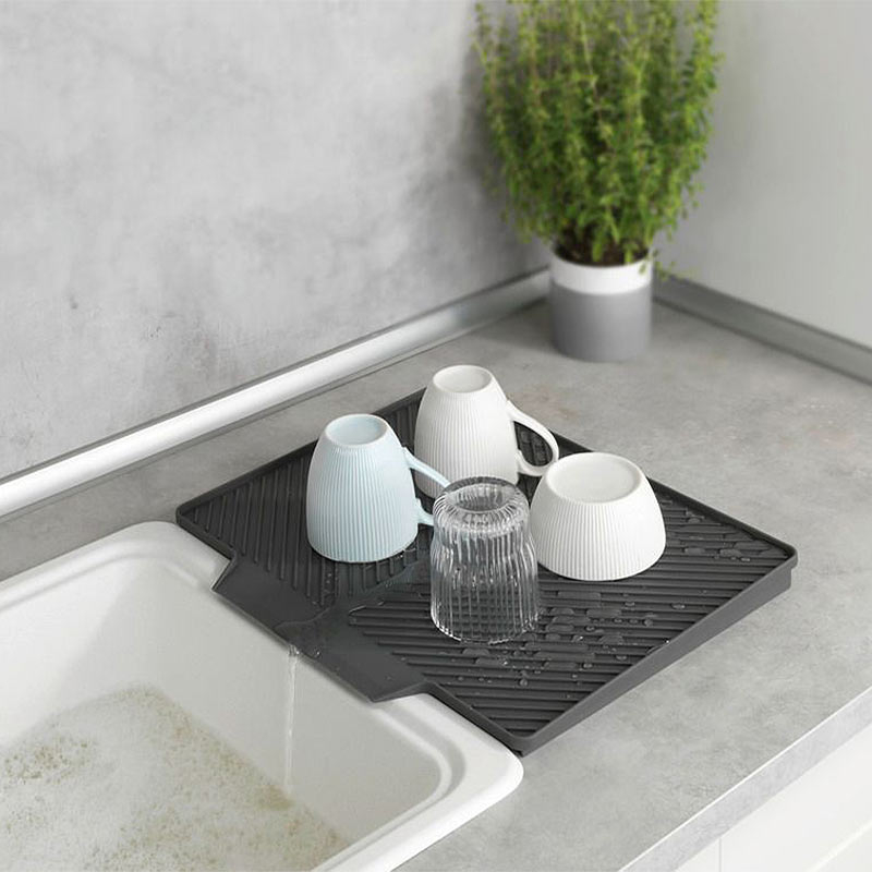 Δίσκος αποστράγγισης της γερμανικής εταιρείας Wenko. Είναι κατασκευασμένος από θερμοπλαστικό λάστιχο (καουτσούκ) σε γκρι απόχρωση, που αποτρέπει την ολίσθηση. Το νερό της αποστράγγισης διατρέχει εύκολα προς τον νεροχύτη χάρη στην αυλακωτή, κεκλιμένη επιφάνειά του και έτσι τα αντικείμενα στεγνώνουν πιο γρήγορα. Κατάλληλο για πλύσιμο στο πλυντήριο πιάτων.