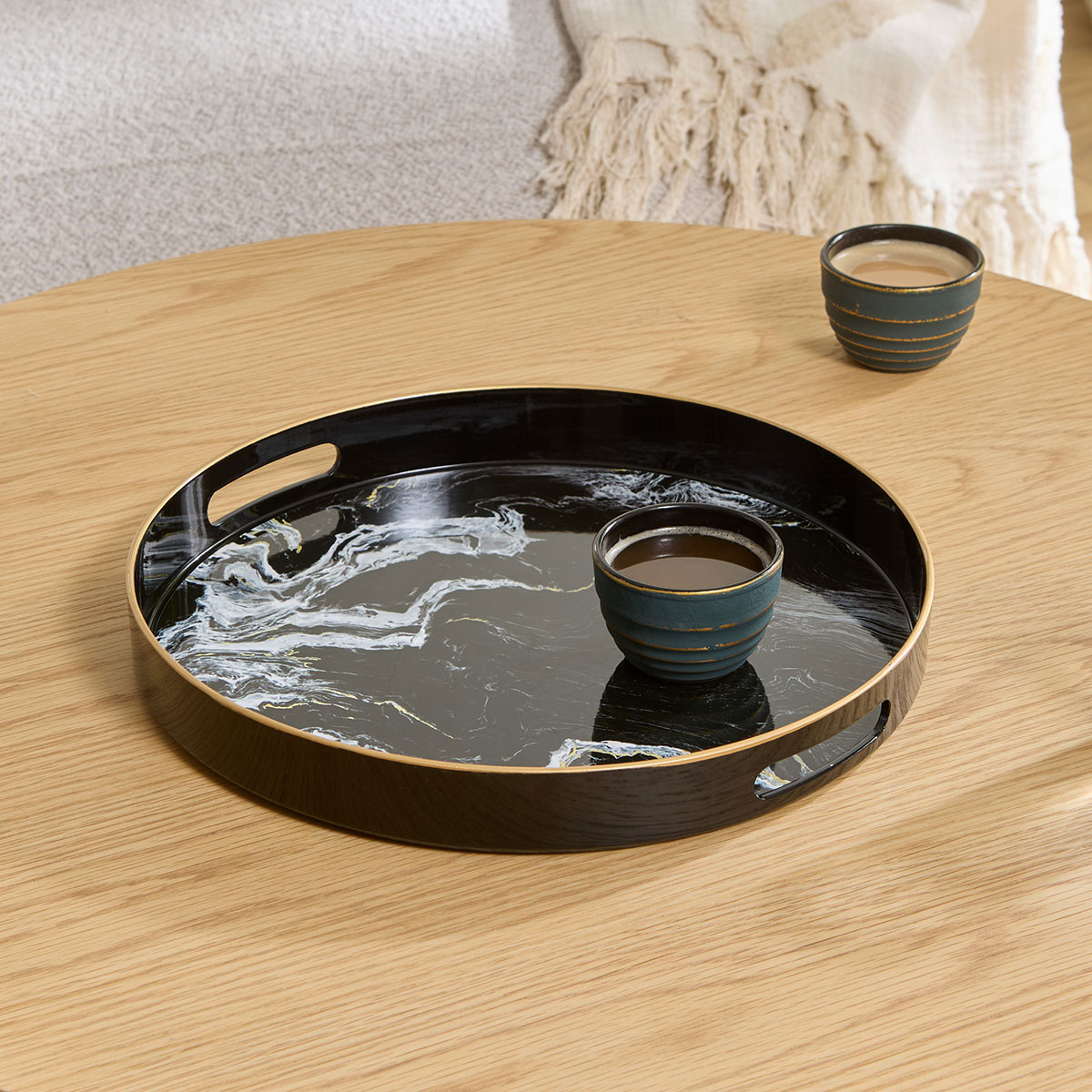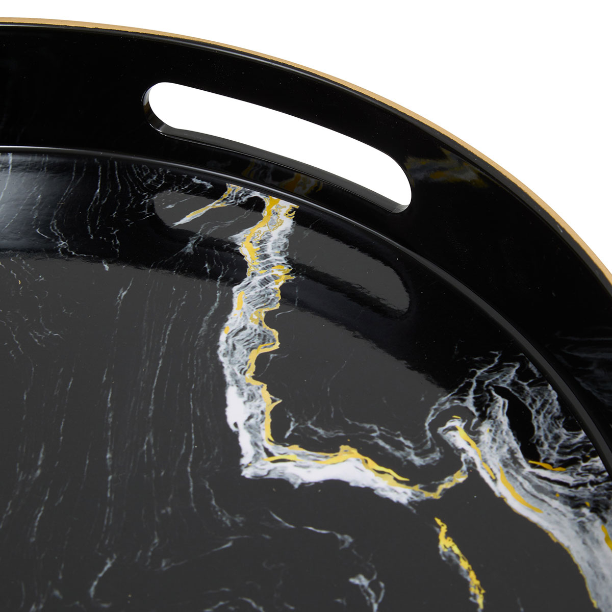 Δίσκος διακόσμησης με μοντέρνο σχεδιασμό. Είναι κατασκευασμένος από πλαστικό υλικό σε μαύρο χρώμα με εφέ μαρμάρου. Διαθέτει λαβές για εύκολη μεταφορά. Τοποθετήστε τον στο τραπεζάκι του σαλονιού ή την τραπεζαρία και δημιουργήστε την διακόσμηση που επιθυμείτε. Ιδανικός για να δώσει μοντέρνα πινελιά στην διακόσμηση του σπιτιού σας.