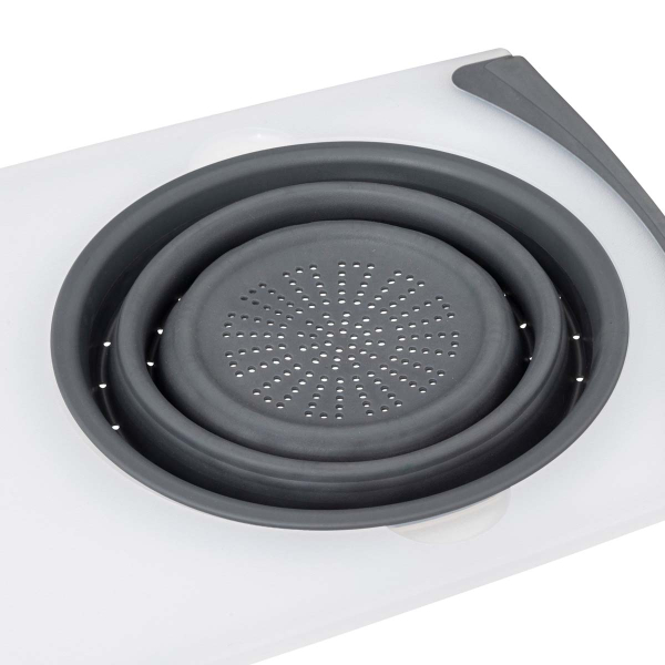 Δίσκος κοπής από πλαστικό υλικό σε λευκό και γκρι χρώμα. Το μήκος του τον καθιστά ιδανικό για τοποθέτηση πάνω από τον νεροχύτη. Στην μία πλευρά διαθέτει σουρωτήρι ώστε να κόβετε και να πλένετε απευθείας τα φρούτα τα λαχανικά. Το σουρωτήρι είναι πτυσσόμενο, ώστε να πιάνει πολύ λιγότερο χώρο κατά την αποθήκευση.