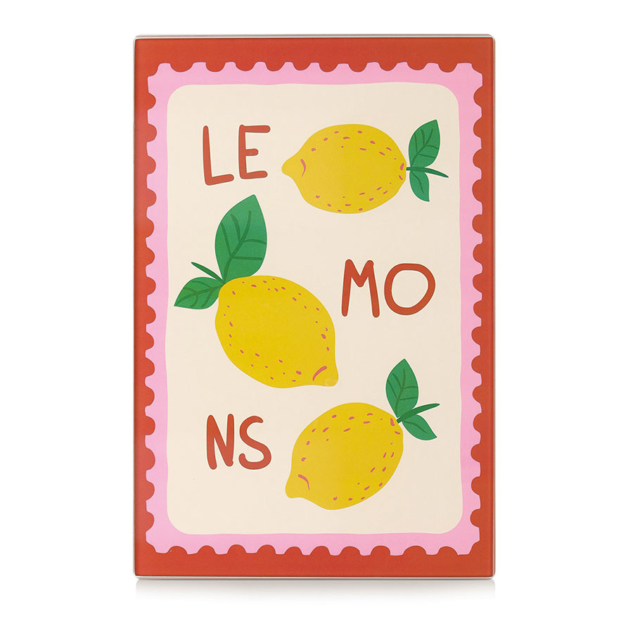 Δίσκος κοπής κατασκευασμένος από tempered γυαλί σε ροζ, κόκκινο και μπεζ χρώμα με σχέδιο λεμόνια σε κίτρινο και πράσινο χρώμα. Το γυαλί είναι ασφαλείας και είναι κατάλληλο για επαφή με τρόφιμα. Ιδανικός για να κόβετε στην επιφάνειά του οποιαδήποτε τροφή χρειάζεστε χωρίς να αφήνετε χαρακιές στους πάγκους της κουζίνας σας. Μπορεί να χρησιμοποιηθεί και ως δίσκος σερβιρίσματος. Συνδυάστε τον με τα υπόλοιπα είδη του ίδιου σετ για ένα ολοκληρωμένο αποτέλεσμα στο χώρο σας.