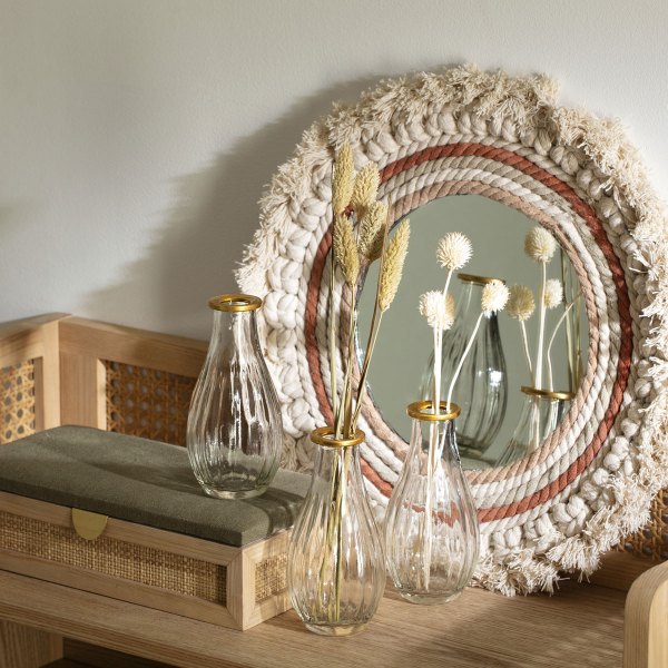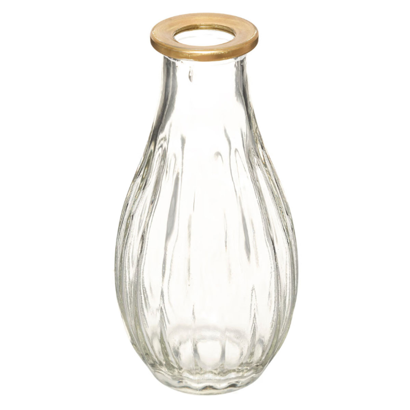 Βάζα διακόσμησης με μίνιμαλ ύφος σε διάφανο χρώμα και χρυσή λεπτομέρεια. Είναι κατασκευασμένα από γυαλί. Ιδανικά βάζα για να τοποθετηθούν στην τραπεζαρία ή στο τραπεζάκι σαλονιού.