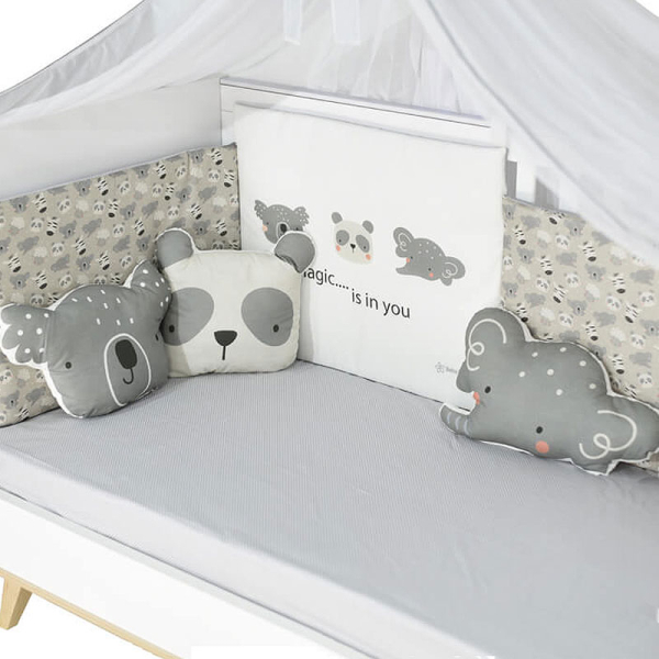 Διακοσμητικά μαξιλάρια σετ για το παιδικό ή το βρεφικό δωμάτιο από την εταιρία Bebe Stars. Το σετ περιλαμβάνει 1 μαξιλάρι με γέμιση σε σχήμα ελεφαντάκι, 1 μαξιλάρι με γέμιση σε σχήμα κοάλα και 1 μαξιλάρι με γέμιση σε σχήμα panda. Είναι φτιαγμένα από βαμβακερό ύφασμα και υποαλλεργική, μαλακή γέμιση που τα καθιστά μαλακά και αφράτα. Η εσωτερική γέμιση δεν αφαιρείται. Με τα μαξιλαράκια μπορείτε να διακοσμήσετε τόσο το κρεβατάκι του μικρού σας, όσο και να δημιουργήσετε μία υπέροχη γωνιά παιχνιδιού στο παιδικό δωμάτιο. Συνδυάστε τα με τα υπόλοιπα προϊόντα της ίδιας συλλογής για ένα ολοκληρωμένο αποτέλεσμα.