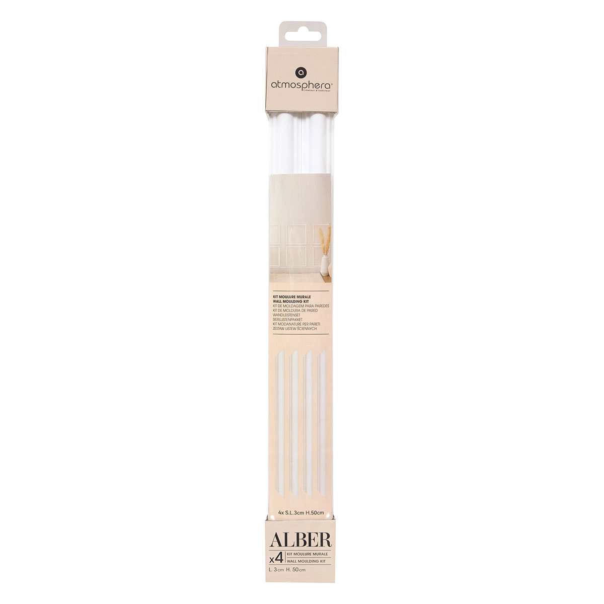 Διακοσμητικά πηχάκια τοίχου σε σετ 4 τεμαχίων. Είναι κατασκευασμένα από ανακυκλωμένο πλαστικό υλικό (PS) σε λευκό χρώμα. Όταν συναρμολογηθούν, σχηματίζουν ένα κομψό τετράγωνο διακοσμητικό πλαίσιο διαστάσεων 50x50. Ιδανικά για να δημιουργήσετε μοντέρνα αισθητική στο σαλόνι, το υπνοδωμάτιο ή σε επαγγελματικό χώρο. Προσθέτουν βάθος, χαρακτήρα και διαχρονική κομψότητα, ανανεώνοντας εύκολα τη διακόσμηση τοίχου με minimal και μοντέρνο αποτέλεσμα.
