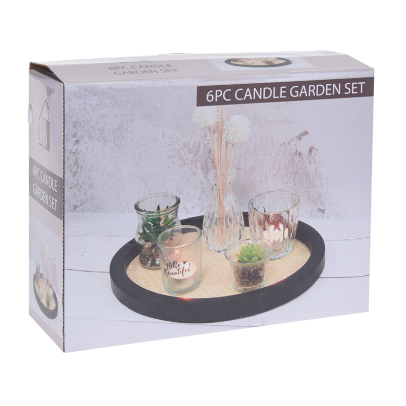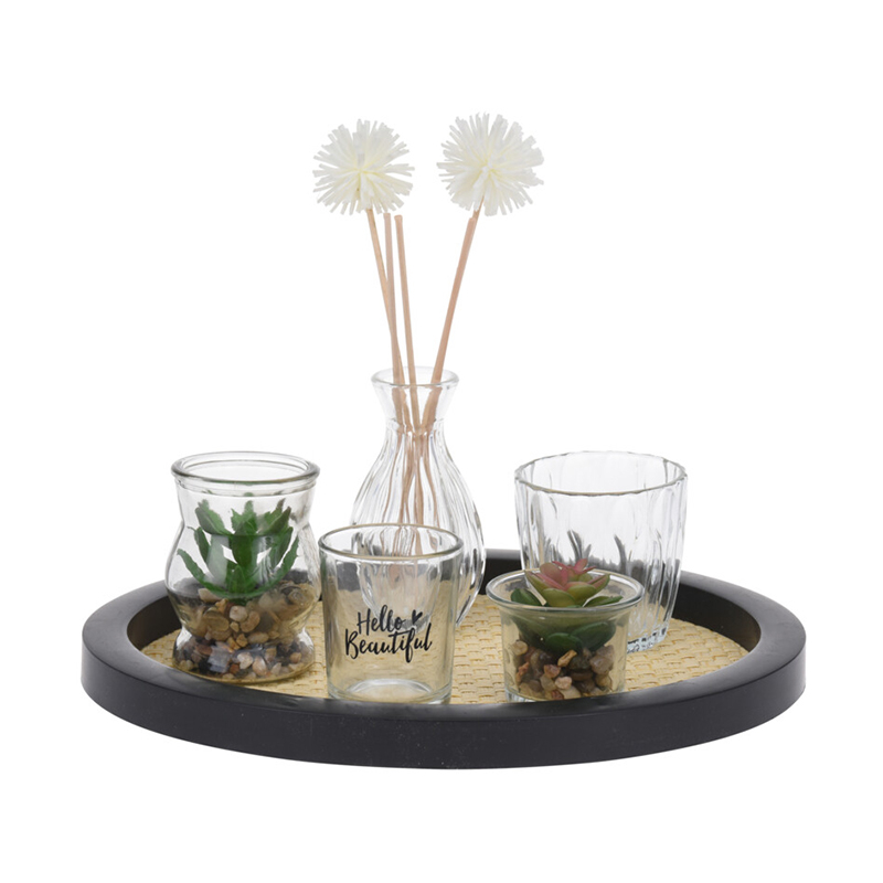Διακοσμητικά χώρου σε δίσκο, με μοντέρνο σχεδιασμό και κατασκευασμένα από γυαλί. Το σε περιλαμβάνει 2 κηροπήγια, 2 γλαστράκια με τεχνητά φυτά, 1 βάζο με διακοσμητικά λουλούδια και 1 πλαστικό δίσκο. Ιδανικά για να διακοσμήσετε κάθε εσωτερικό ή εξωτερικό χώρο.