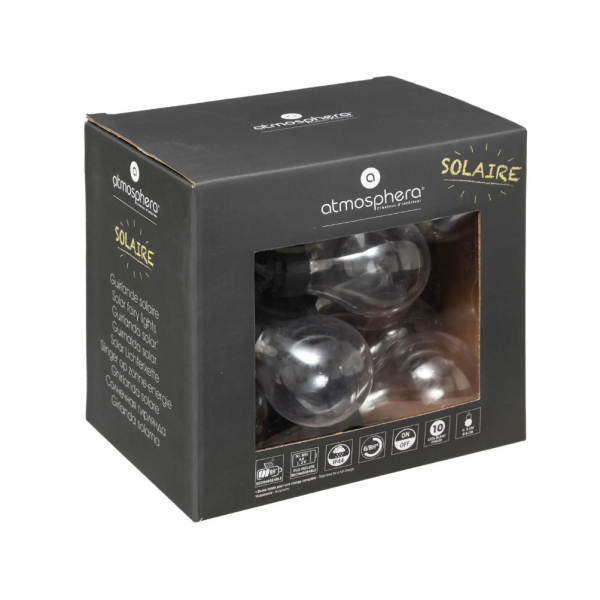 Διακοσμητική ηλιακή γιρλάντα με 10 Led φωτάκια. Οι λάμπες είναι πολύχρωμες με διάσταση 6x13 και έχουν θερμό λευκό φως. Τροφοδοτείται από μία επαναφορτιζόμενη μπαταρία AA NIMH χωρητικότητας 1500mAh. Κατά τη διάρκεια της ημέρας, η ηλιακή ενέργεια επαναφορτίζει την εσωτερική μπαταρία μέσω του ενσωματωμένου πάνελ και το βράδυ ανάβει αυτόματα. Μετά από πλήρη φόρτιση έχει αυτονομία 6-8 ώρες. Ιδανικό για τον κήπο, την βεράντα ή οποιονδήποτε άλλο εξωτερικό χώρο.