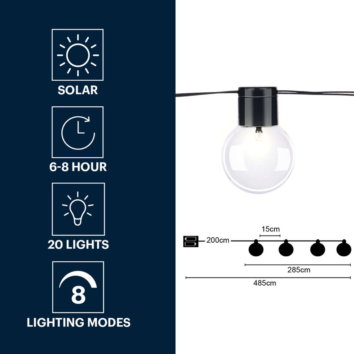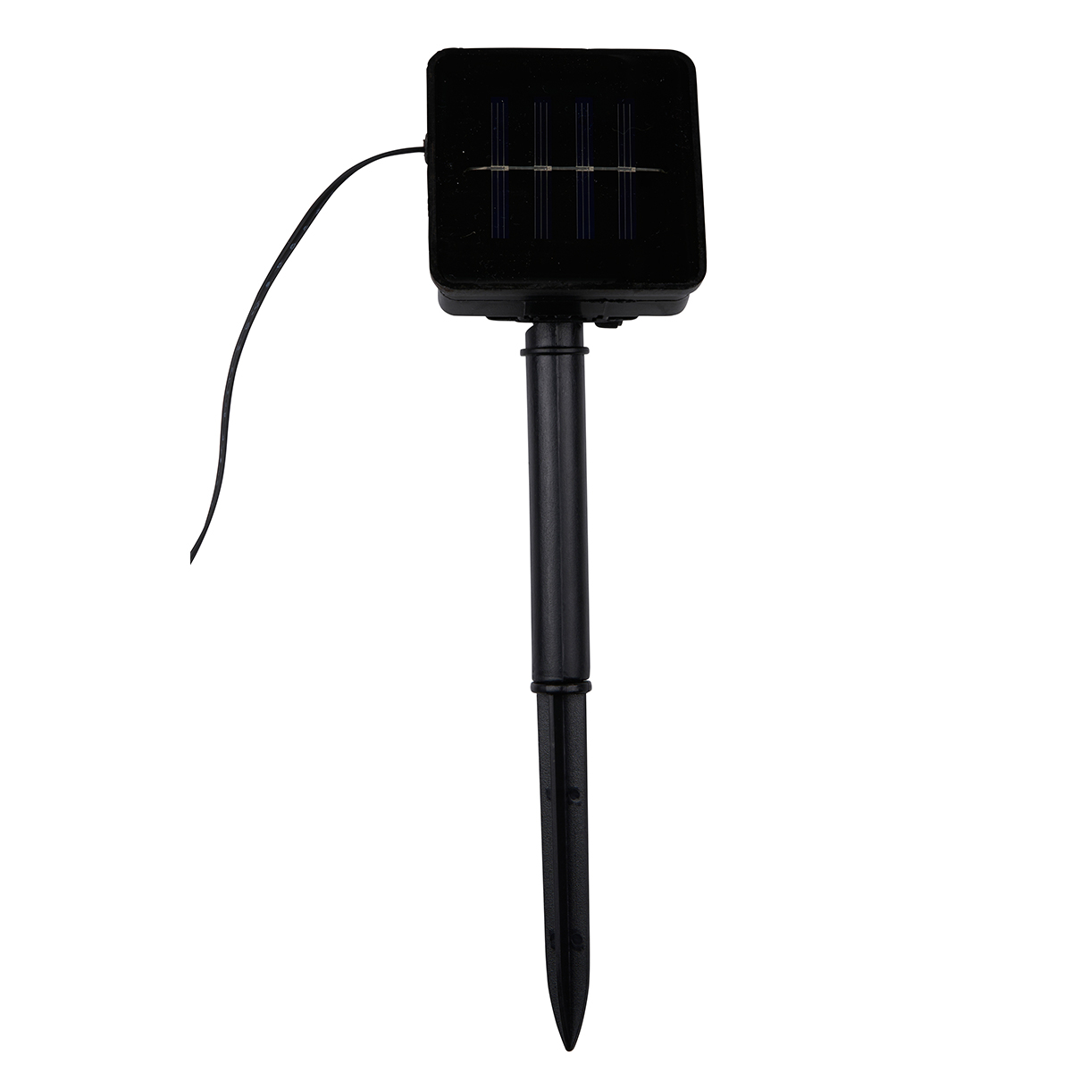Διακοσμητική γιρλάντα με 20 Led φωτάκια από την εταιρεία Grundig. Είναι κατασκευασμένη από πλαστικό υλικό σε μαύρο χρώμα. Οι λάμπες έχουν διάσταση Φ4.9εκ.x8εκ.Υ και απόσταση μεταξύ τους 15εκ. Έχει 8 εντάσεις φωτισμού και τροφοδοτείται από μία επαναφορτιζόμενη μπαταρία AA Ni-mh, 1.2V χωρητικότητας 600mAh. Κατά τη διάρκεια της ημέρας, η ηλιακή ενέργεια επαναφορτίζει την εσωτερική μπαταρία μέσω του ενσωματωμένου πάνελ και το βράδυ ανάβει αυτόματα. Μετά από πλήρη φόρτιση έχει αυτονομία 6-8 ωρών. Είναι αδιάβροχη και ιδανική για τον κήπο, την βεράντα ή οποιονδήποτε άλλο εξωτερικό χώρο.