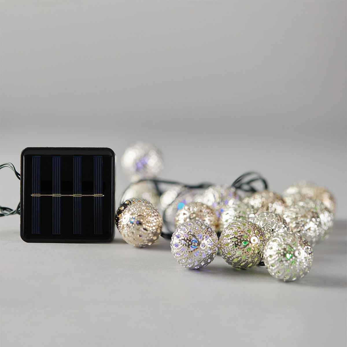 Διακοσμητική γιρλάντα με 40 Led φωτάκια και πολύχρωμο φωτισμό από την εταιρεία Eurolamp. Διαθέτει 8 προγράμματα για να διαλέξετε. Είναι κατασκευασμένη από πλαστικό υλικό και έχει μήκος 4.9 μέτρα. Διαθέτει 40 ασημί μπάλες διαμέτρου 3εκ. που απέχουν μεταξύ τους 10εκ. Στην άκρη του καλωδίου διαθέτει ηλιακό συλλέκτη. Κατά τη διάρκεια της ημέρας, η ηλιακή ενέργεια φορτίζει το πάνελ ώστε να μπορεί να λειτουργήσει. Έχει βαθμό στεγανότητας IP44 που τη καθιστά ιδανική για τον κήπο, την βεράντα ή οποιονδήποτε άλλο εξωτερικό χώρο.