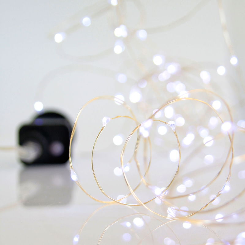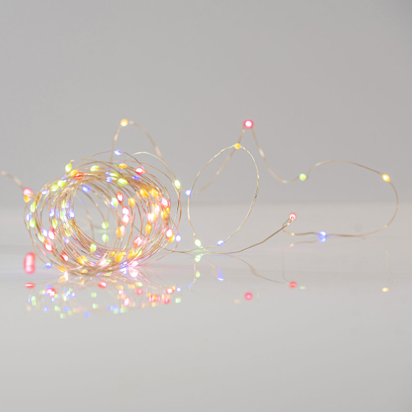 Διακοσμητική γιρλάντα με mini Led φωτάκια από την εταιρεία Eurolamp. Είναι κατασκευασμένη από ασημί καλώδιο χαλκού. Έχει 100 Led λαμπάκια με ψυχρό λευκό φωτισμό που έχουν 10εκ. απόσταση μεταξύ τους. Διαθέτει 8 προγράμματα φωτισμού. Έχει μήκος 1 μέτρο και επιπλέον μισό μέτρο καλώδιο επέκτασης με αντάπτορα. Με βαθμό στεγανότητας IP44 που τη καθιστά κατάλληλη και για εξωτερικούς χώρους. Διαθέτει ενσωματωμένες πλακέτες Led συνολικής ισχύος 3.6Watt, ψυχρού λευκού φωτός (7500Κ-8500Κ).