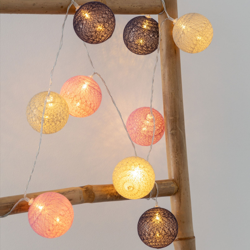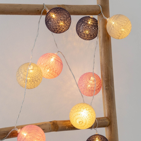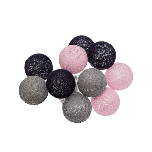 Διακοσμητική γιρλάντα με 10 Led φωτάκια. Είναι κατασκευασμένη από πλαστικό υλικό και βαμβακερό νήμα σε γκρι, μαύρο και ροζ χρώμα με καλώδιο χαλκού. Οι μπαλίτσες έχουν διάμετρο 6εκ. Λειτουργεί με 2 μπαταρίες AA LR6, οι οποίες δεν περιλαμβάνονται. Κατάλληλη για όλους τους εσωτερικούς χώρους. Το μήκους του καλωδίου είναι 165εκ. και στο τέλος του διαθέτει διακόπτη ON/OFF.