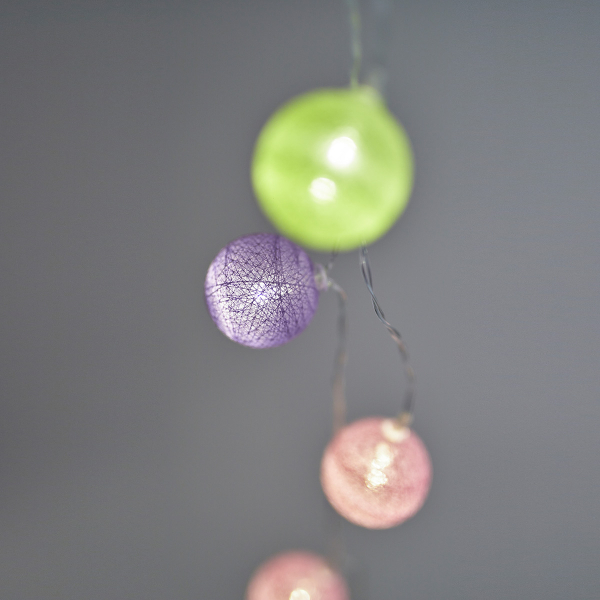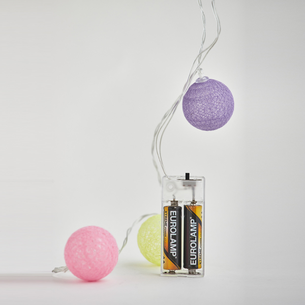 Διακοσμητική γιρλάντα μπαταρίας με Led φωτάκια από την εταιρεία Eurolamp. Είναι κατασκευασμένη από διάφανο πλαστικό καλώδιο και έχει 10 πολύχρωμες υφασμάτινες μπαλίτσες. Έχει βαθμό στεγανότητας IP20 που τη καθιστά κατάλληλη για εσωτερικούς χώρους. Διαθέτει 10 Led λαμπάκια με θερμό λευκό φωτισμό με διάμετρο 4εκ. που έχουν 15εκ. απόσταση μεταξύ τους και χρονοδιακόπτη. Λειτουργεί με 2 μπαταριές ΑΑ (δεν περιλαμβάνονται). Το συνολικό μήκος είναι 1.65 μέτρα εκ των οποίων τα 30εκ. είναι καλώδιο επέκτασης. Διαθέτει ενσωματωμένες πλακέτες Led συνολικής ισχύος 0.6Watt, λευκού θερμού φωτός (2200Κ-2300Κ).