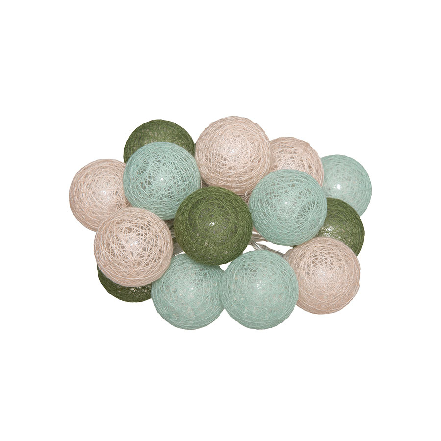 Διακοσμητική γιρλάντα με 16 Led φωτάκια. Είναι κατασκευασμένη από πλαστικό υλικό και βαμβακερό νήμα σε χακί, βεραμάν και γκρι χρώμα με καλώδιο χαλκού. Οι μπαλίτσες έχουν διάμετρο 3.5εκ. Λειτουργεί με 2 μπαταρίες AA LR6, οι οποίες δεν περιλαμβάνονται. Κατάλληλη για όλους τους εσωτερικούς χώρους. Το μήκους του καλωδίου είναι 255εκ. και στο τέλος του διαθέτει διακόπτη ON/OFF.