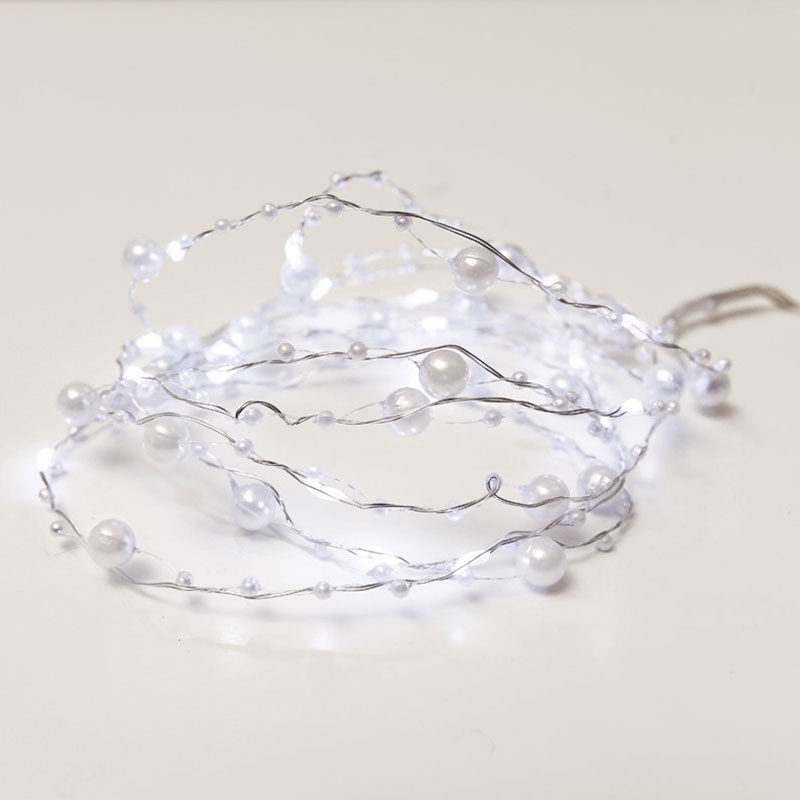Διακοσμητική γιρλάντα με φωτάκια Led της εταιρείας Aca Decor. Έχει 20 Led λαμπάκια και πέρλες σε ασημί χρώμα. Λειτουργεί με 2 μπαταρίες AA LR6, οι οποίες δεν περιλαμβάνονται. Τα λαμπάκια έχουν 10εκ. απόσταση μεταξύ τους. Κατάλληλη για όλους τους εσωτερικούς χώρους. Το συνολικό μήκους του καλωδίου είναι 210εκ. και στο τέλος του διαθέτει διακόπτη ON/OFF. Έχει ενσωματωμένες πλακέτες Led συνολικής ισχύος 1.2Watt, ψυχρού λευκού φωτός (6000K).