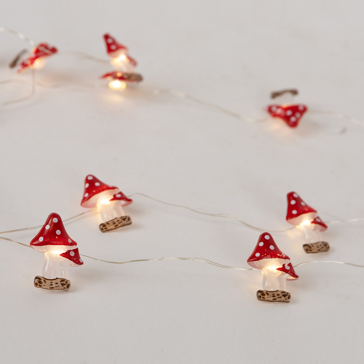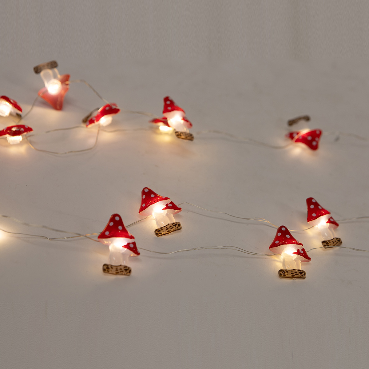 Διακοσμητική γιρλάντα μπαταρίας με Led φωτάκια από την εταιρεία Eurolamp. Είναι κατασκευασμένη από διάφανο πλαστικό καλώδιο και έχει 20 κόκκινα μανιτάρια κατασκευασμένα από ακρυλικό υλικό. Έχει βαθμό στεγανότητας IP20 που τη καθιστά κατάλληλη για εσωτερικούς χώρους. Διαθέτει 20 Led λαμπάκια με θερμό λευκό φωτισμό που έχουν 10εκ. απόσταση μεταξύ τους. Έχει χρονοδιακόπτη και λειτουργεί με 3 μπαταριές ΑΑ (δεν περιλαμβάνονται). Το συνολικό μήκος είναι 2.2 μέτρα εκ των οποίων τα 30εκ. είναι καλώδιο επέκτασης. Διαθέτει ενσωματωμένες πλακέτες Led συνολικής ισχύος 1.2Watt, λευκού θερμού φωτός (2200Κ-2300Κ).