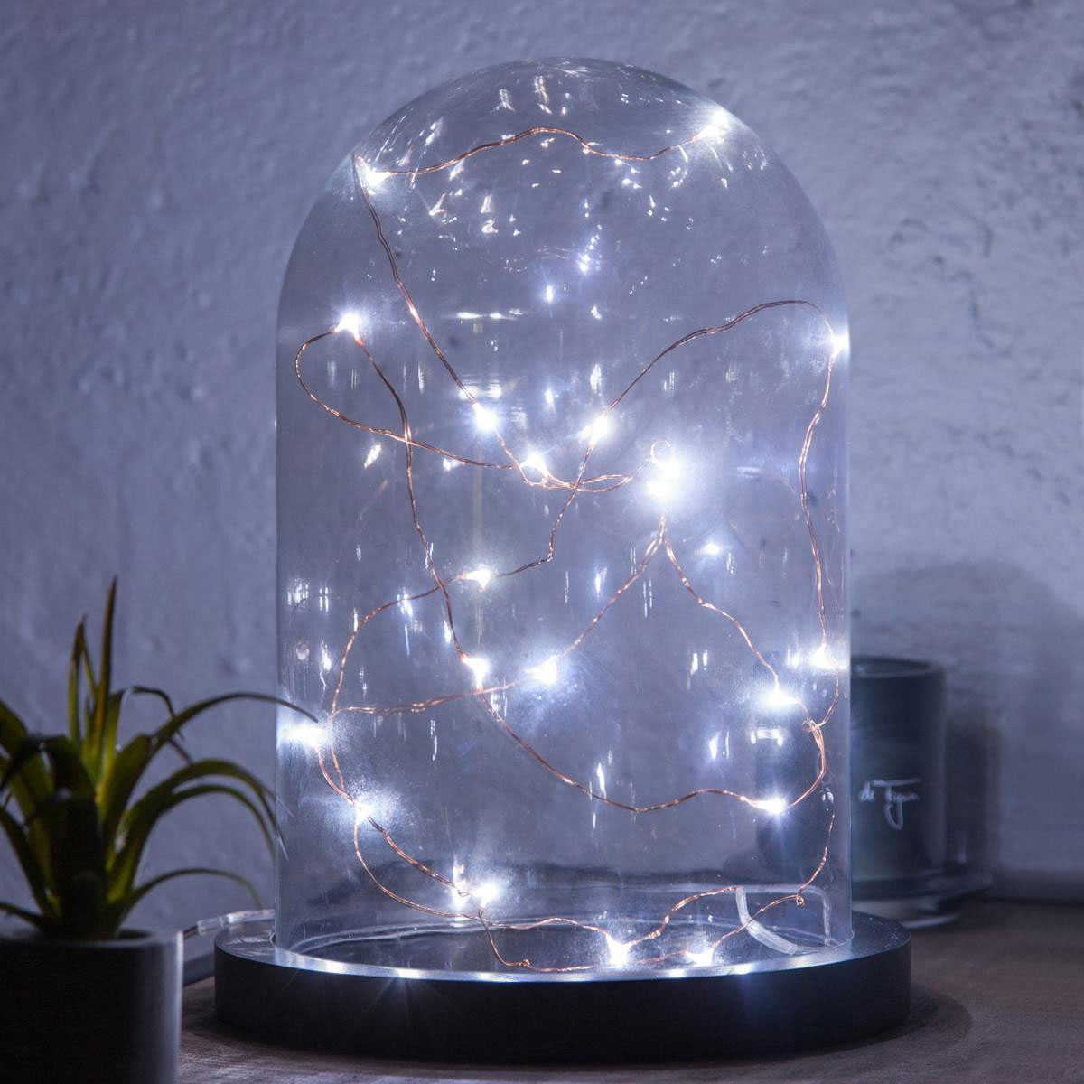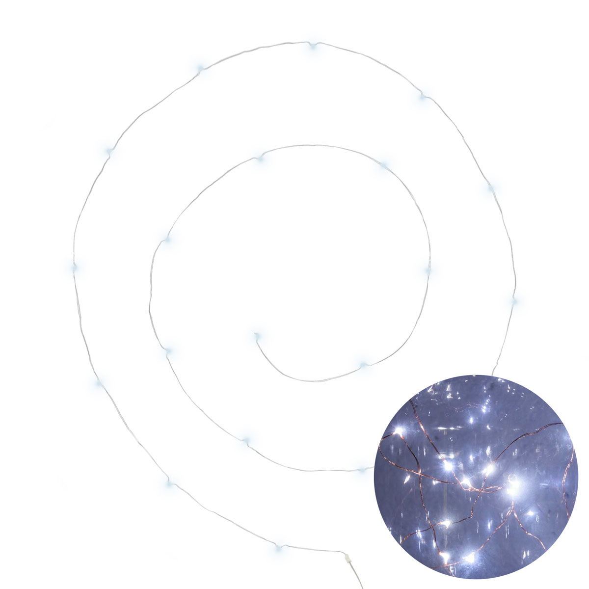 Διακοσμητική γιρλάντα με 20 micro-led φωτάκια ψυχρού λευκού φωτός. Είναι κατασκευασμένη από χαλκό και PVC. Λειτουργεί με 2 μπαταρίες AA LR6, οι οποίες δεν περιλαμβάνονται. Το συνολικό μήκος του καλωδίου είναι 240εκ. Ιδανική γιρλάντα για να τοποθετηθεί σε μία γυάλα και να κάνει την διακόσμηση του χώρου σας ξεχωριστή.