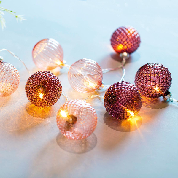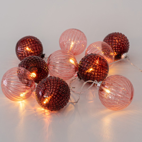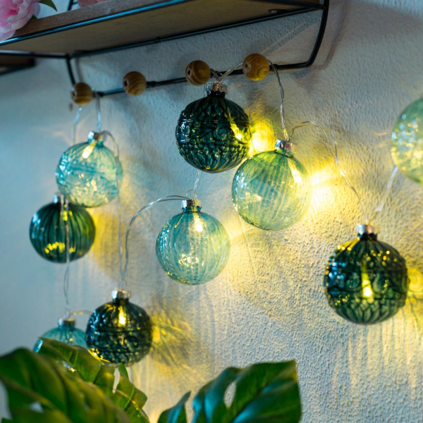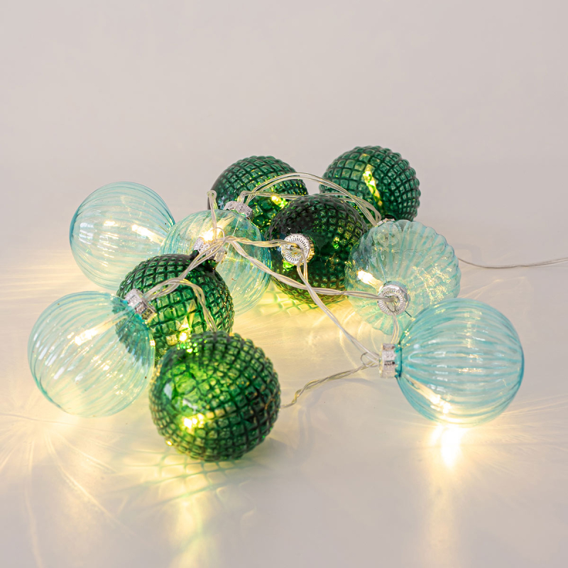 Διακοσμητική γιρλάντα με Led φωτάκια από την εταιρεία Eurolamp. Είναι κατασκευασμένη από διάφανο πλαστικό καλώδιο και έχει 10 γαλάζιες-πράσινες γυάλινες μπαλίτσες. Έχει βαθμό στεγανότητας IP44 που τη καθιστά κατάλληλη και για εξωτερικούς χώρους. Διαθέτει 10 Led λαμπάκια με θερμό λευκό φωτισμό με διάμετρο 6εκ. που έχουν 15εκ. απόσταση μεταξύ τους. Το συνολικό μήκος είναι 4.3 μέτρα εκ των οποίων τα 3 μέτρα είναι καλώδιο επέκτασης με αντάπτορα. Διαθέτει ενσωματωμένες πλακέτες Led συνολικής ισχύος 1.35Watt, λευκού θερμού φωτός (2200Κ-1200Κ).