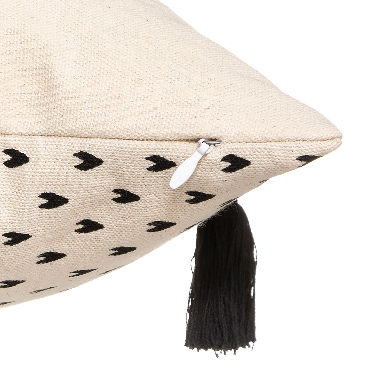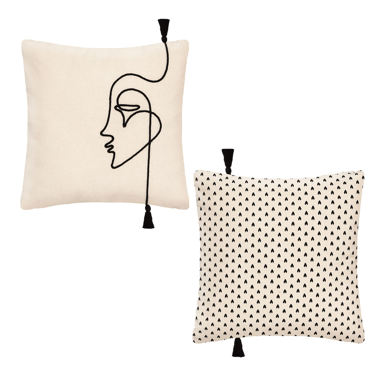 Διακοσμητική μαξιλαροθήκη σε εκρού χρώμα με κεντητό μαύρο σχέδιο φιγούρα από την μια πλευρά και γεωμετρικό σχέδιο από την άλλη πλευρά. Το εξωτερικό ύφασμα είναι από 100% βαμβάκι και διαθέτει διακοσμητικά φουντάκια στις 2 πλευρές.