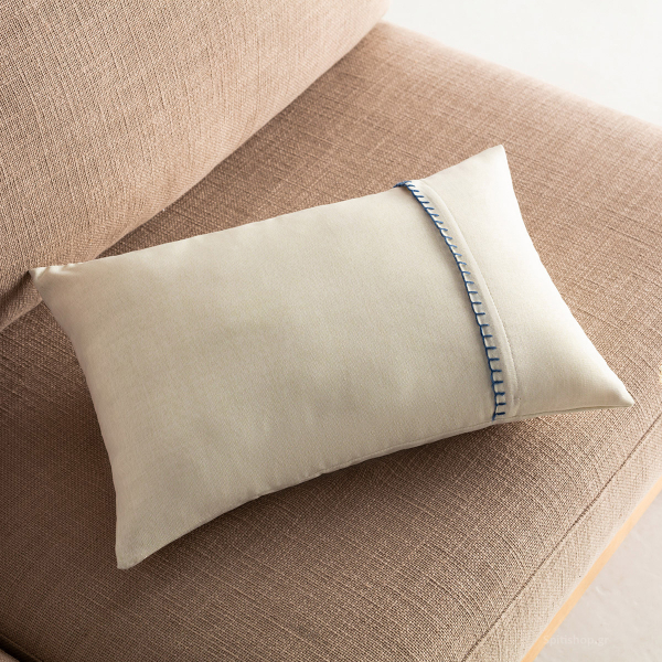 Μονόχρωμη διακοσμητική μαξιλαροθήκη σε εκρού χρώμα και κεντητή λεπτομέρεια σε μπλε χρώμα από την εταιρία Gofis Home. Κατασκευασμένη από 100% πολυεστερικό ύφασμα με ανεξίτηλο χρώμα. Συνδυάστε την με ριχτάρια της εταιρίας Gofis Home για ένα μοναδικό αποτέλεσμα.