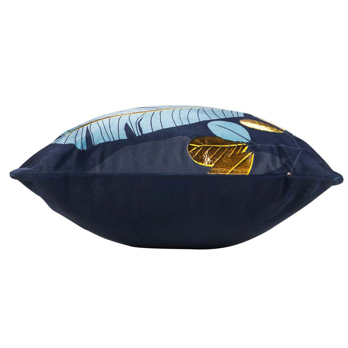 Διακοσμητική μαξιλαροθήκη σε μπλε χρώμα με tropical σχέδιο και γαλάζιες-χρυσές λεπτομέρειες. Το ύφασμά της είναι βελουτέ κατασκευασμένο από 100% Polyester. Διαθέτει φερμουάρ για να αφαιρείται το γέμισμα. Συνδυάστε το με την υπόλοιπη διακόσμηση και δώστε στυλ και χαρακτήρα στο χώρο σας.