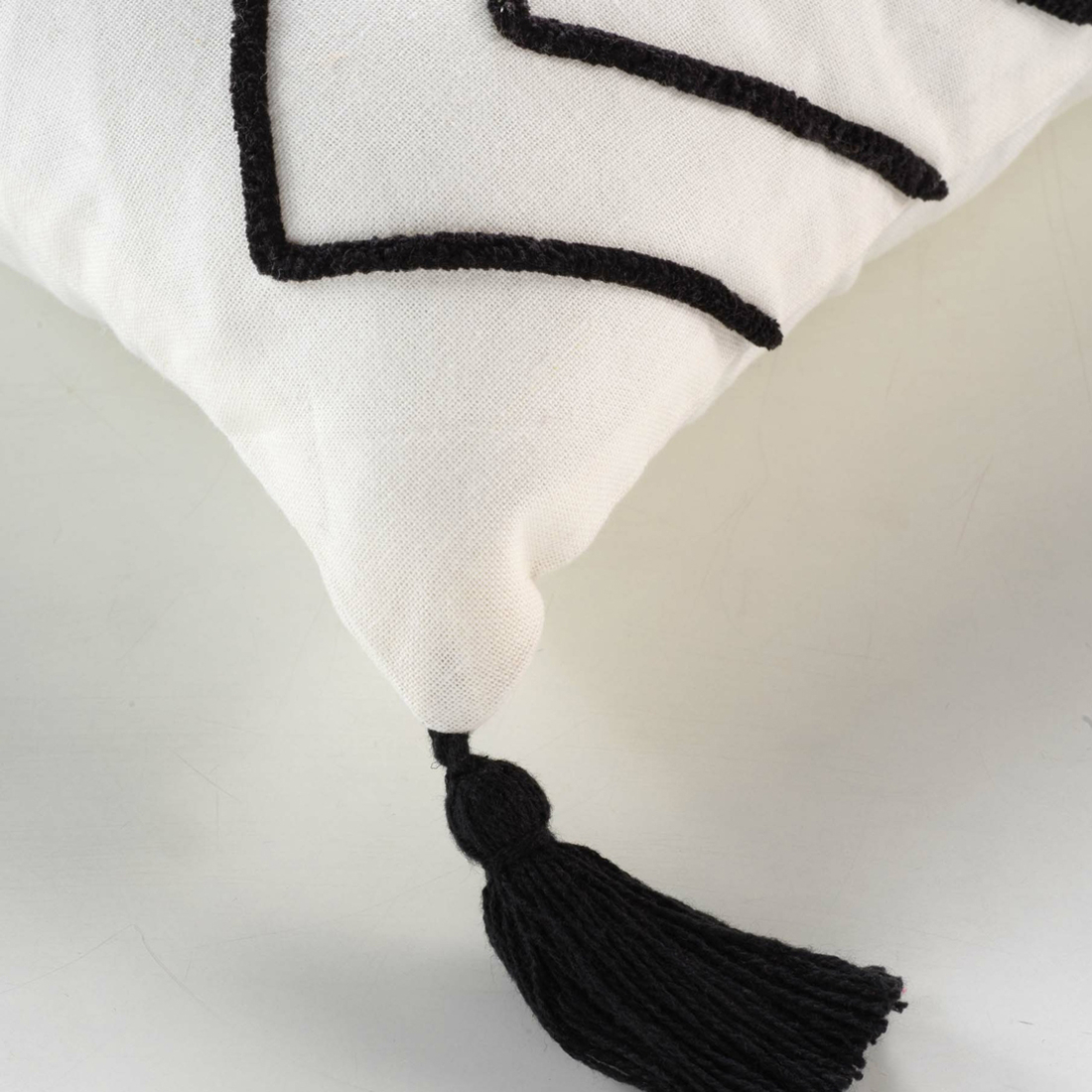 Διακοσμητική μαξιλαροθήκη με γεωμετρικό σχέδιο και φουντίτσες στις 4 γωνίες. Το φόντο είναι λευκό με μαύρες λεπτομέρειες. Το ύφασμα της είναι κατασκευασμένο από 100% βαμβάκι. Συνδυάστε την με την υπόλοιπη διακόσμησή σας για να δώσετε μοναδική όψη στον χώρο σας.