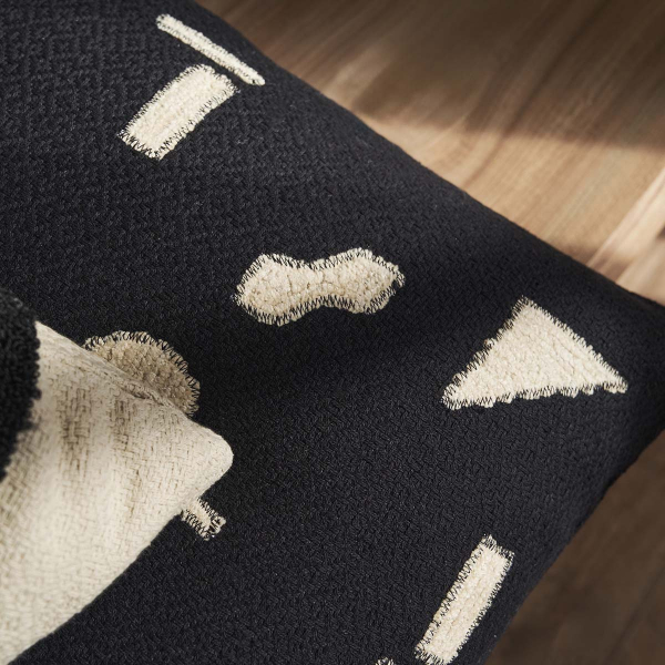 Διακοσμητική μαξιλαροθήκη από την εταιρεία Gofis Home σε μαύρο χρώμα με μπεζ λεπτομέρειες. Είναι κατασκευασμένη από 100% βαμβάκι με χειροποίητο περίτεχνο κέντημα. Διαθέτει φερμουάρ. Ιδανική για να στολίσει το σαλόνι σας με ποιότητα και στυλ.