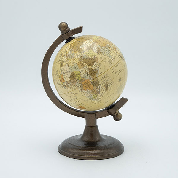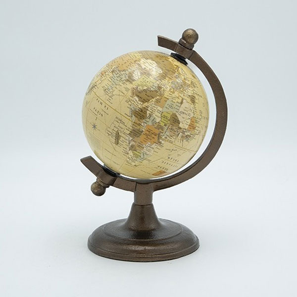 Διακοσμητικό χώρου σε σχήμα υδρόγειου σφαίρας από την εταιρεία Estheti με vintage σχεδιασμό. Έχει μπεζ χρώμα με χρυσές λεπτομέρειες και καφέ βάση. Είναι κατασκευασμένη από μεταλλικό υλικό. Ιδανικό διακοσμητικό για να τοποθετηθεί στο τραπεζάκι του σαλονιού, τον μπουφέ, το γραφείο και όπου αλλού ταιριάζει!