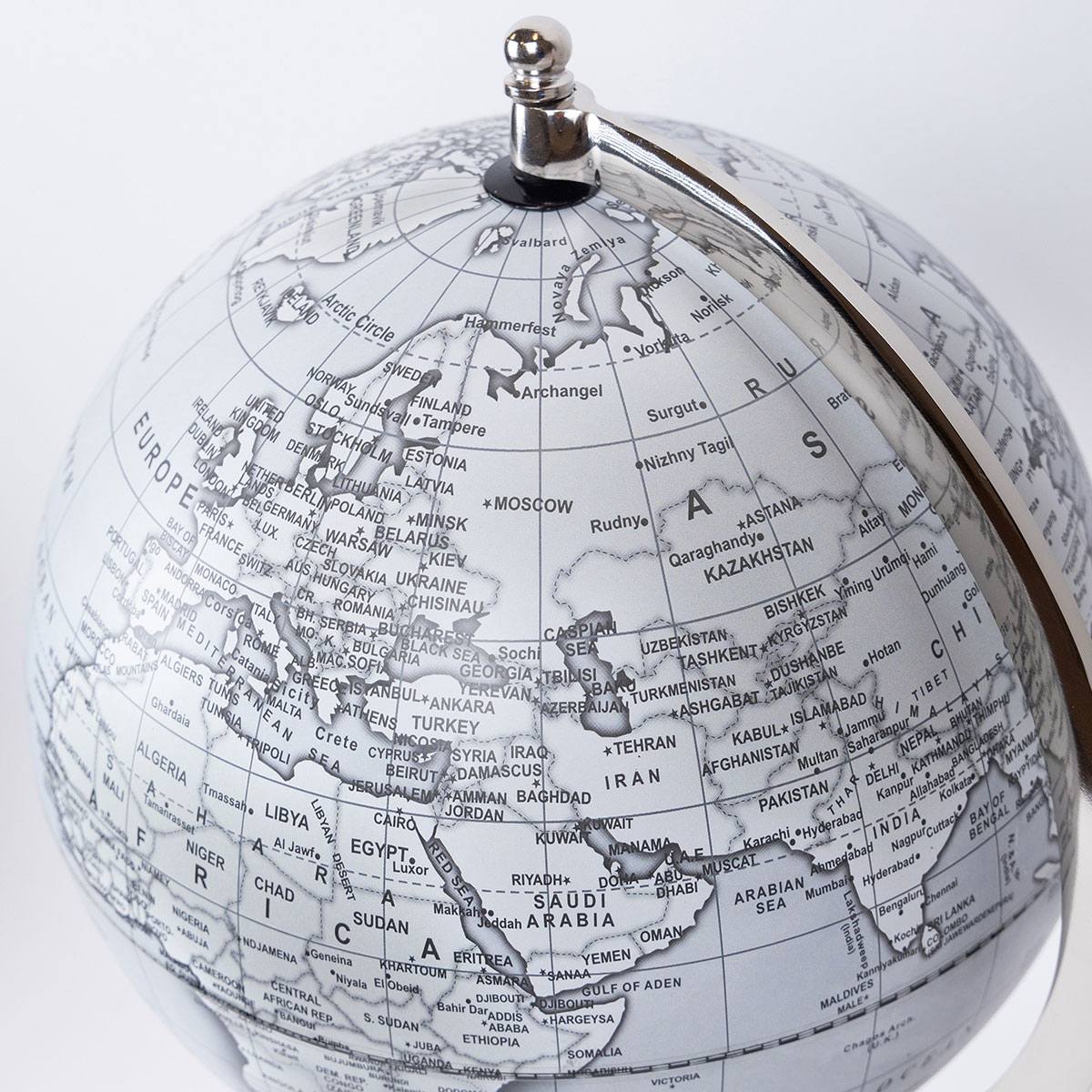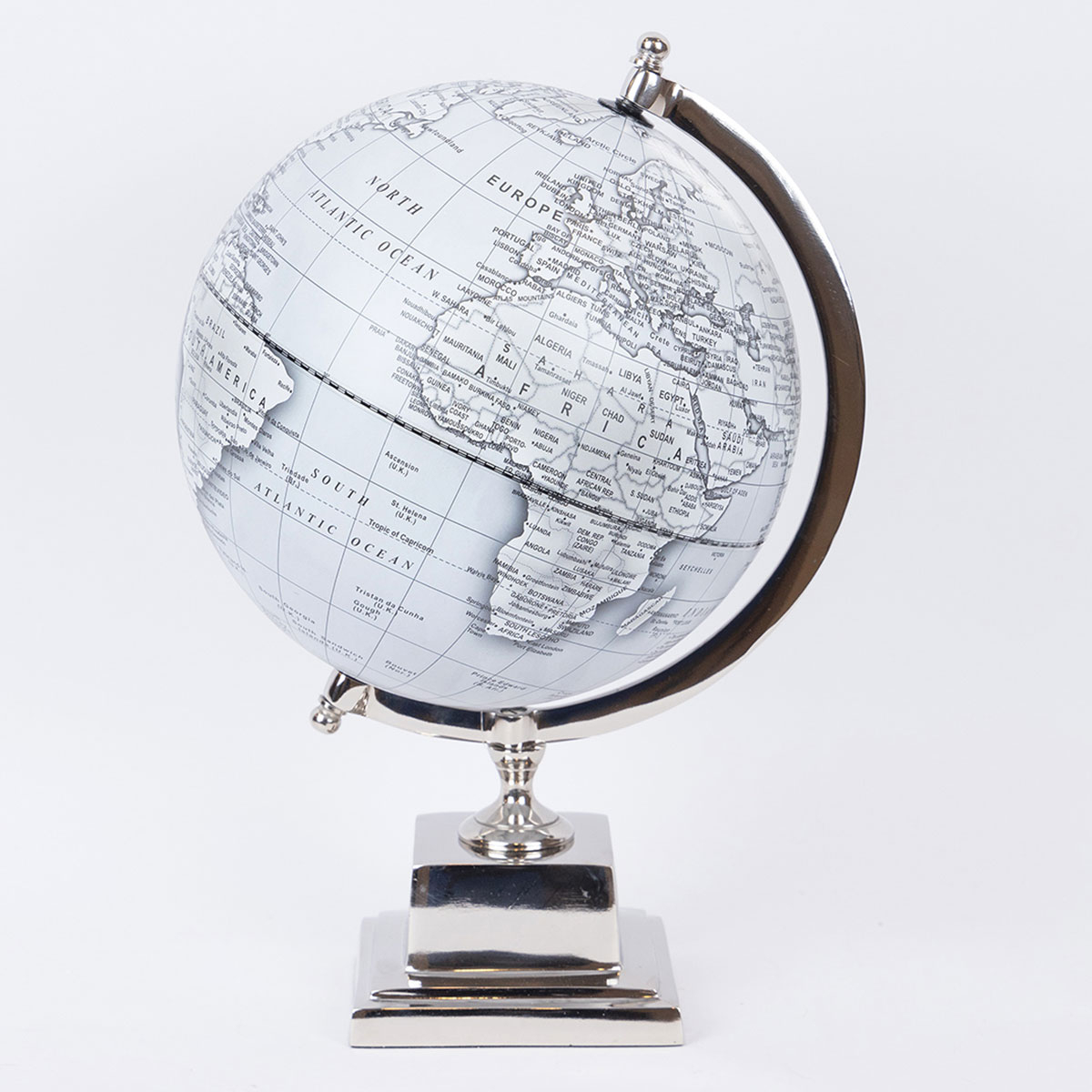 Διακοσμητικό χώρου σε σχήμα υδρόγειου σφαίρας από την εταιρεία Estheti σε ανοιχτό γαλάζιο χρώμα με μοντέρνο σχεδιασμό. Η βάση της είναι μεταλλική σε ασημί χρώμα. Ιδανικό για να τοποθετηθεί στο τραπεζάκι του σαλονιού, τον μπουφέ, το γραφείο και όπου αλλού ταιριάζει!