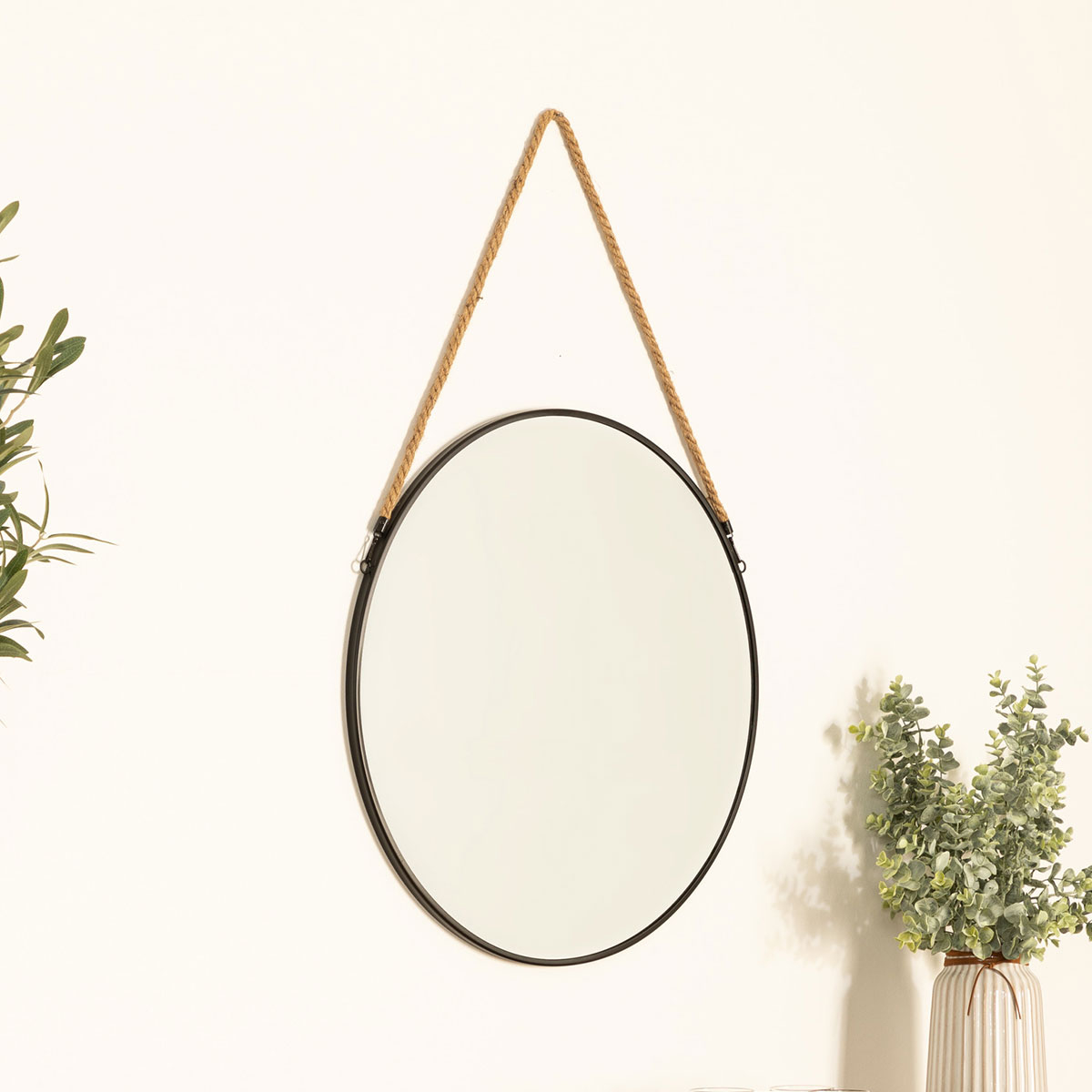 Στρογγυλός καθρέφτης τοίχου ιδανικός για τοποθέτηση στο υπνοδωμάτιο, το χωλ, το γραφείο ή σε όποιον άλλο χώρο σας είναι απαραίτητος. Το πλαίσιο του είναι μεταλλικό σε μαύρη απόχρωση. Κρεμιέται στον τοιχό με ένα σχοινί από φυσική γιούτα. Μπορεί να λειτουργήσει ως χρηστικό και ως διακοσμητικό στοιχείο στο χώρο σας.
