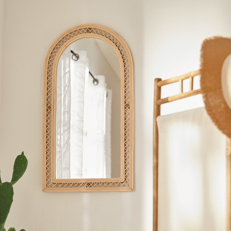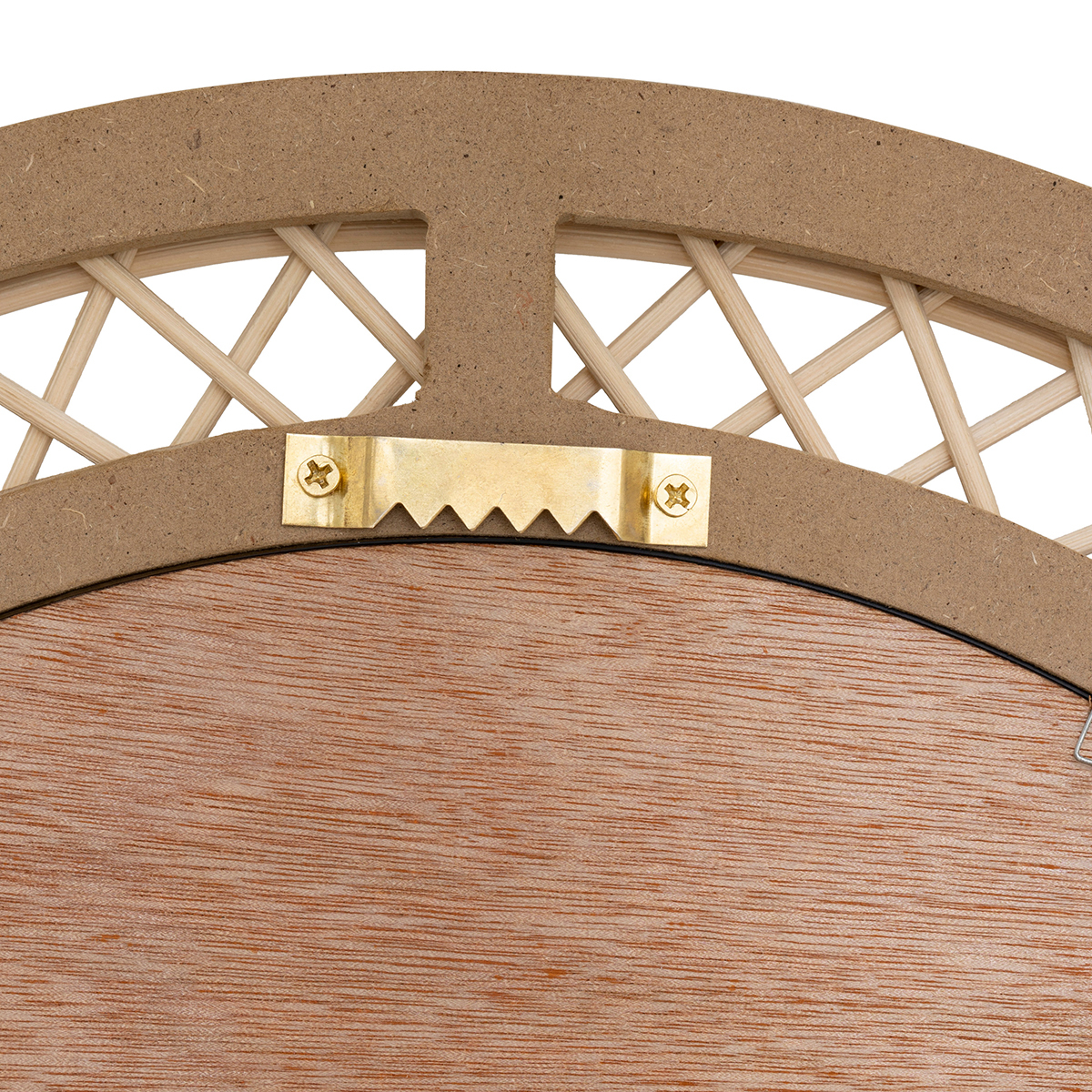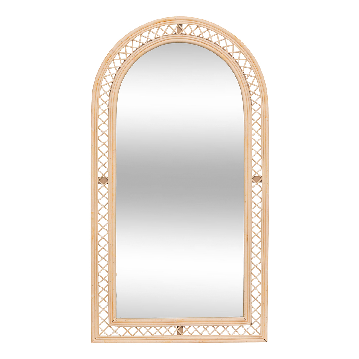 Επιτοίχιος καθρέφτης με έθνικ ύφος, ιδανικός για να διακοσμήσει το υπνοδωμάτιο, το χωλ, το γραφείο, ή σε όποιο άλλο χώρο ταιριάζει. Είναι κατασκευασμένος από ξύλο rattan και MDF_E1 σε μπεζ χρώμα. Διαθέτει υποδοχή για κρέμασμα στο πίσω μέρος σε κάθετη μορφή. Μπορεί να λειτουργήσει ως χρηστικό και ως διακοσμητικό στοιχείο στο χώρο σας.