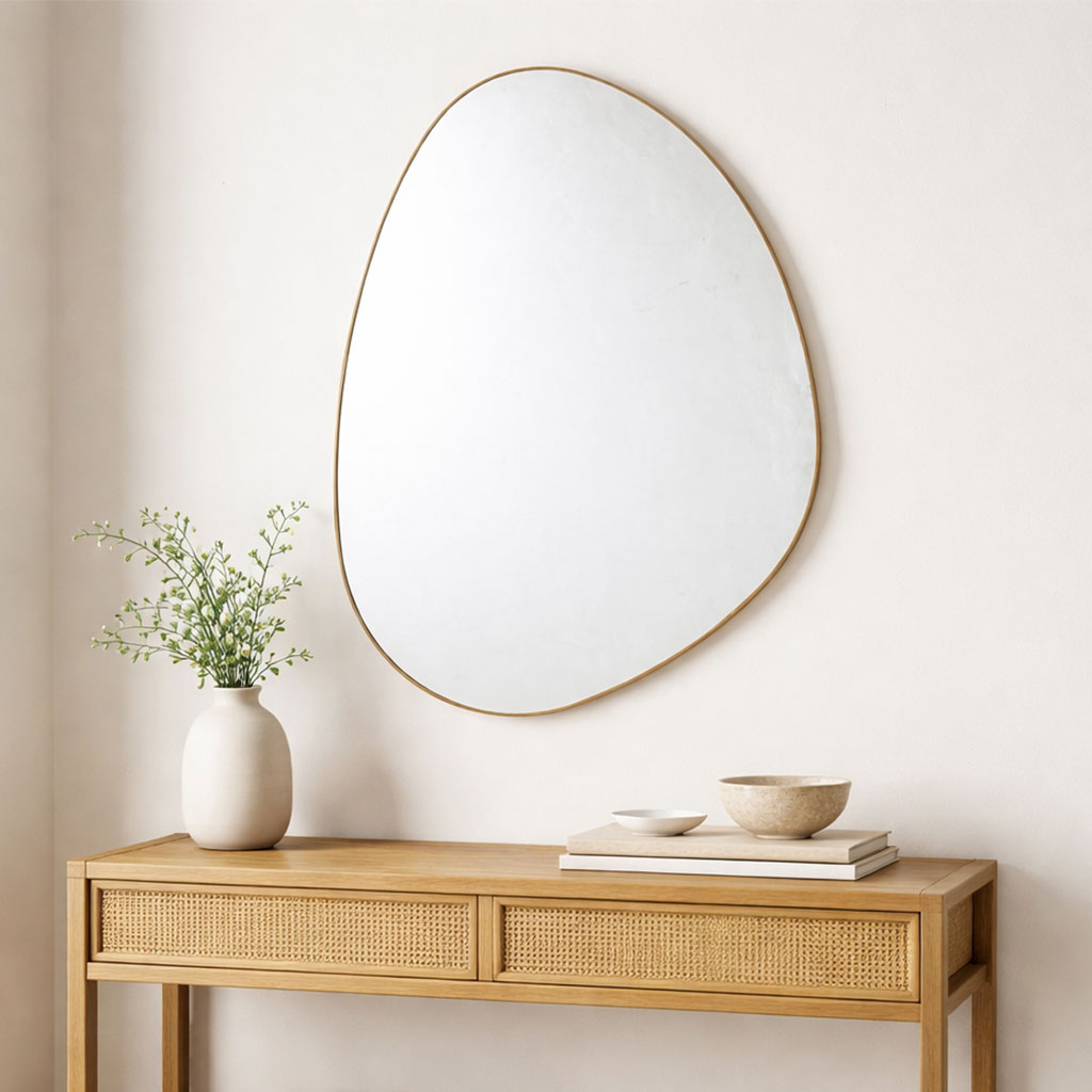 Επιτοίχιος καθρέφτης με μίνιμαλ αισθητική, ιδανικός για να διακοσμήσει το υπνοδωμάτιο, το χωλ, το γραφείο, ή σε όποιο άλλο χώρο ταιριάζει. Το πλαίσιο είναι κατασκευασμένο από υλικό MDF σε μπεζ χρώμα με εφέ ξύλου και έχει σχήμα σταγόνας. Διαθέτει υποδοχή για κρέμασμα στο πίσω μέρος σε κάθετη μορφή. Μπορεί να λειτουργήσει ως χρηστικό και ως διακοσμητικό στοιχείο στο χώρο σας. Συνδυάστε τον με τα υπόλοιπα είδη της ίδιας συλλογής για ένα ολοκληρωμένο αποτέλεσμα.