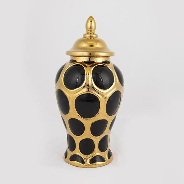 Διακοσμητικό βάζο με καπάκι από την εταιρεία Estheti σε χρυσό-μαύρο χρώμα με μοντέρνο σχέδιο. Είναι κατασκευασμένο από κεραμικό υλικό. Τοποθετήστε το στο σαλόνι ή την τραπεζαρία και ταιριάξτε το με άλλα είδη διακόσμησης απ' το Spitishop για να φτιάξετε το σπίτι που πάντα ονειρευόσασταν.