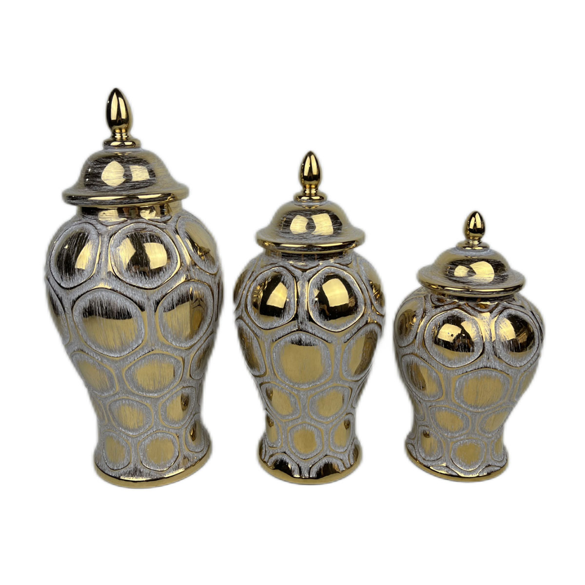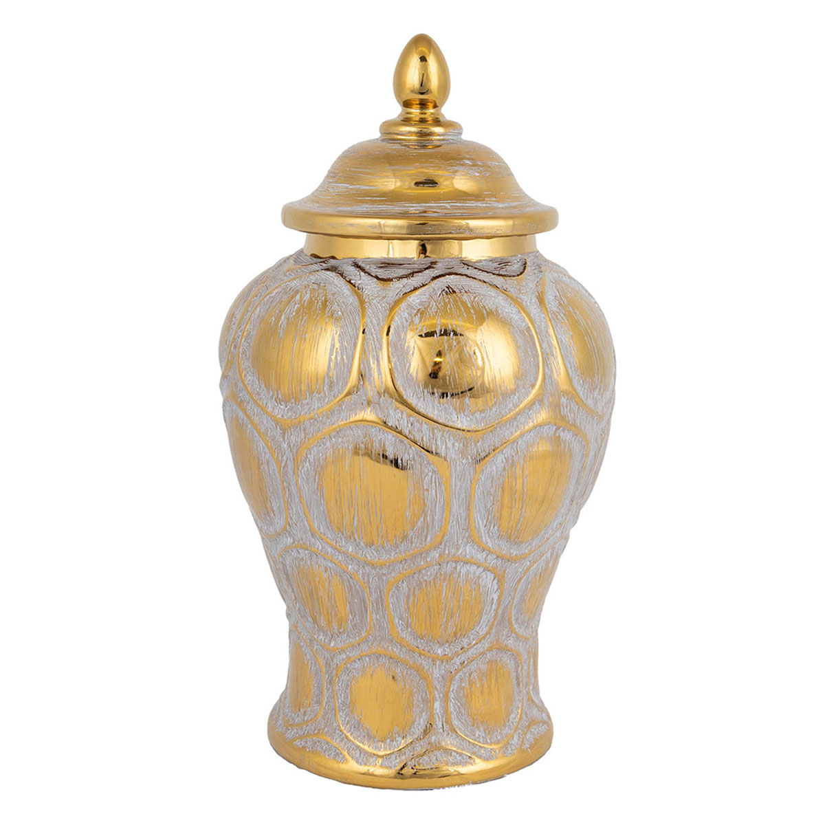 Διακοσμητικό βάζο με καπάκι από την εταιρεία Estheti σε χρυσό χρώμα με γκρι λεπτομέρειες vintage σχέδιο. Είναι κατασκευασμένο από κεραμικό υλικό. Τοποθετήστε το στο σαλόνι ή την τραπεζαρία και ταιριάξτε το με άλλα είδη διακόσμησης απ' το Spitishop για να φτιάξετε το σπίτι που πάντα ονειρευόσασταν.