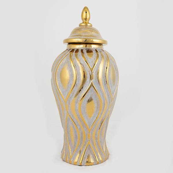 Διακοσμητικό βάζο με καπάκι από την εταιρεία Estheti σε χρυσό χρώμα με γκρι λεπτομέρειες vintage σχέδιο. Είναι κατασκευασμένο από κεραμικό υλικό. Τοποθετήστε το στο σαλόνι ή την τραπεζαρία και ταιριάξτε το με άλλα είδη διακόσμησης απ' το Spitishop για να φτιάξετε το σπίτι που πάντα ονειρευόσασταν.