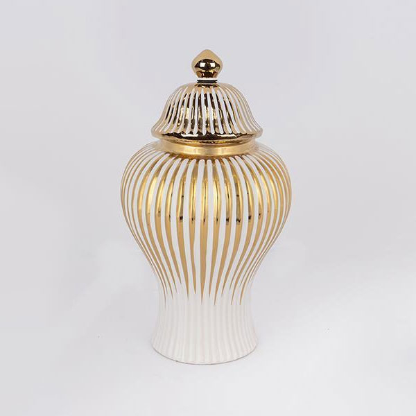 Διακοσμητικό βάζο με καπάκι από την εταιρεία Estheti σε χρυσό χρώμα με λευκές λεπτομέρειες vintage σχέδιο. Είναι κατασκευασμένο από κεραμικό υλικό. Τοποθετήστε το στο σαλόνι ή την τραπεζαρία και ταιριάξτε το με άλλα είδη διακόσμησης απ' το Spitishop για να φτιάξετε το σπίτι που πάντα ονειρευόσασταν.