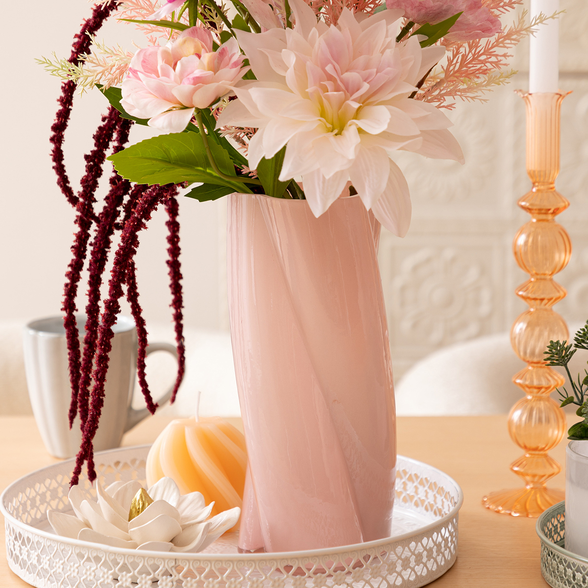 Διακοσμητικό βάζο με μίνιμαλ σχεδιασμό. Είναι κατασκευασμένο από γυαλί σε ροζ απόχρωση και ακανόνιστο σχήμα. Ιδανικό για το σαλόνι, την τραπεζαρία ή οποιονδήποτε άλλο χώρο επιθυμείτε να διακοσμήσετε και να δώσετε στυλ. Συνδυάστε το με τα υπόλοιπα είδη της ίδιας συλλογής για ένα ολοκληρωμένο αποτέλεσμα στο χώρο σας.