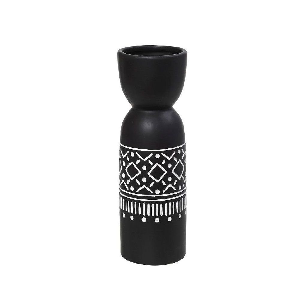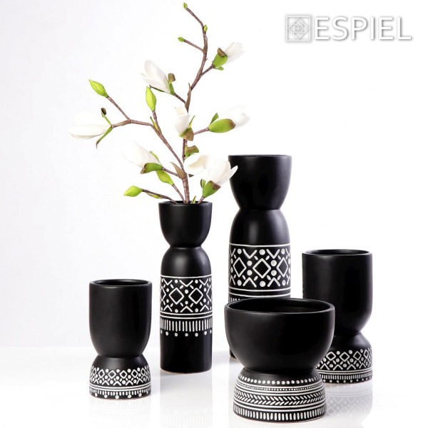 Διακοσμητικό βάζο από την εταιρεία Espiel σε μαύρο χρώμα με λευκές λεπτομέρειες και έθνικ σχέδιο. Είναι κατασκευασμένο από κεραμικό υλικό. Τοποθετήστε το στην τραπεζαρία ή στο τραπεζάκι του σαλονιού σας και κλέψτε τις εντυπώσεις των καλεσμένων σας. Μπορεί να χρησιμοποιηθεί για να τοποθετήσετε μέσα ψεύτικα διακοσμητικά λουλούδια. Συνδυάστε το με τα υπόλοιπα είδη της ίδιας σειράς για ένα ολοκληρωμένο σετ.