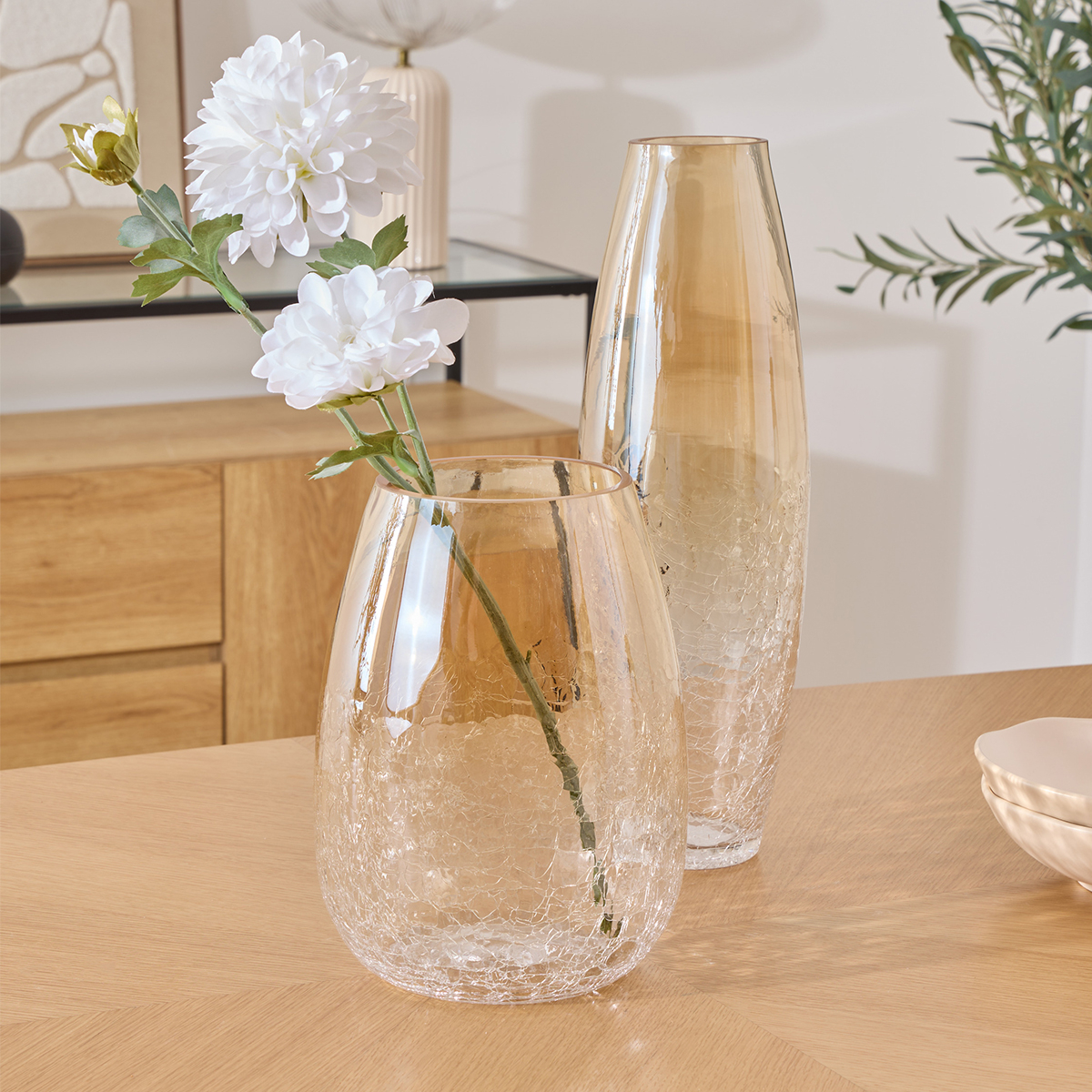 Διακοσμητικό βάζο με μοντέρνα αισθητική. Είναι κατασκευασμένο από γυαλί στο χρώμα της ώχρας με εφέ σπασμένου γυαλιού. Ιδανικό για το σαλόνι, την τραπεζαρία ή οποιονδήποτε άλλο χώρο επιθυμείτε να διακοσμήσετε και να δώσετε στυλ. Συνδυάστε το με τα υπόλοιπα είδη της ίδιας συλλογής για ένα ολοκληρωμένο αποτέλεσμα στο χώρο σας.