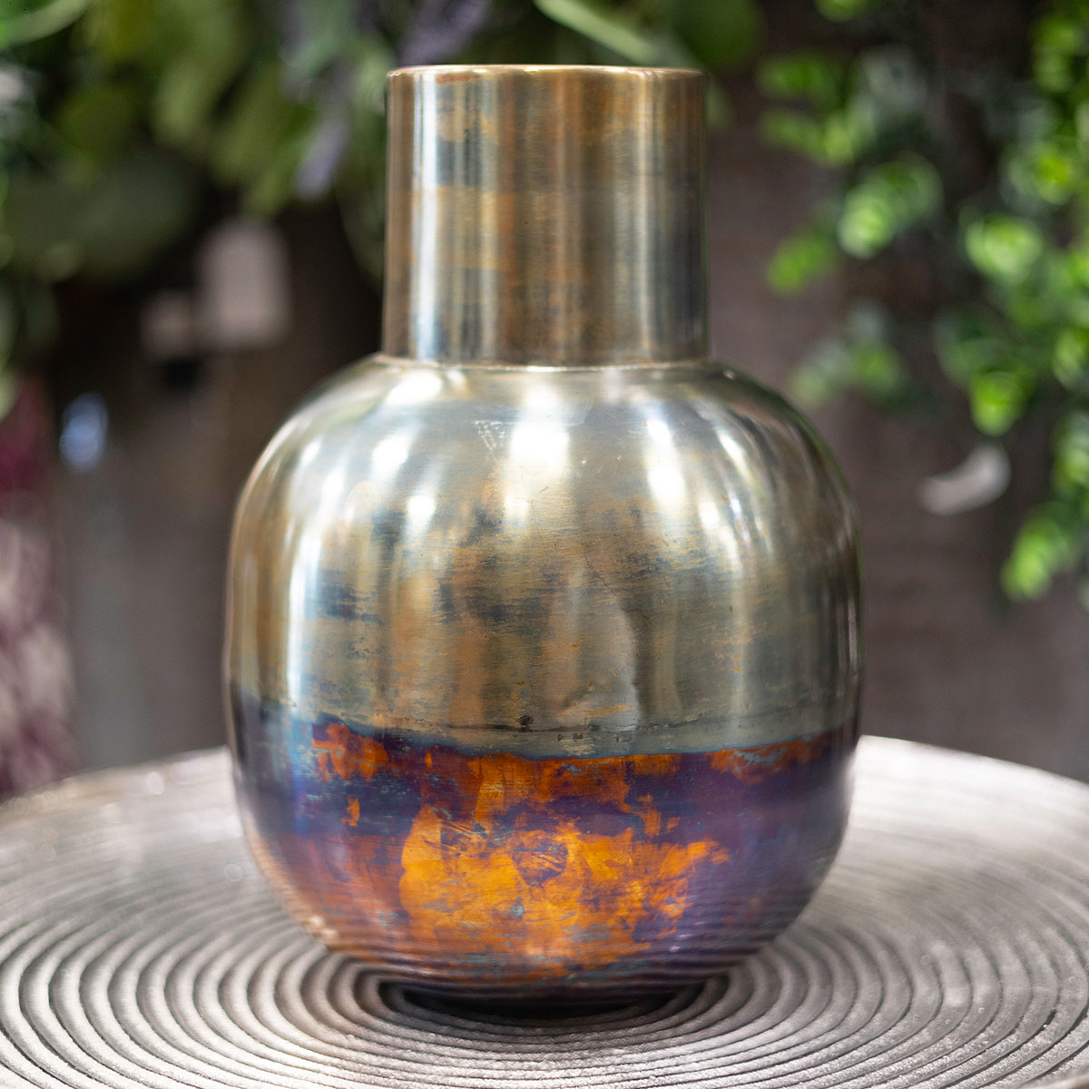 Διακοσμητικό βάζο από την εταιρεία Mod με vintage σχέδιο. Έχει οξειδωμένο μπρονζέ φινίρισμα που δίνει μια μπλε απόχρωση. Είναι κατασκευασμένο από μεταλλικό υλικό. Μπορεί να χρησιμοποιηθεί για να τοποθετήσετε μέσα λουλούδια ή μόνο του σαν διακοσμητικό. Τοποθετήστε το στο σαλόνι, την τραπεζαρία ή σε οποιοδήποτε άλλο σημείο για να το διακοσμήσετε. Συνδυάστε το με τα υπόλοιπα είδη της σειράς για ένα ολοκληρωμένο διακοσμητικό αποτέλεσμα.