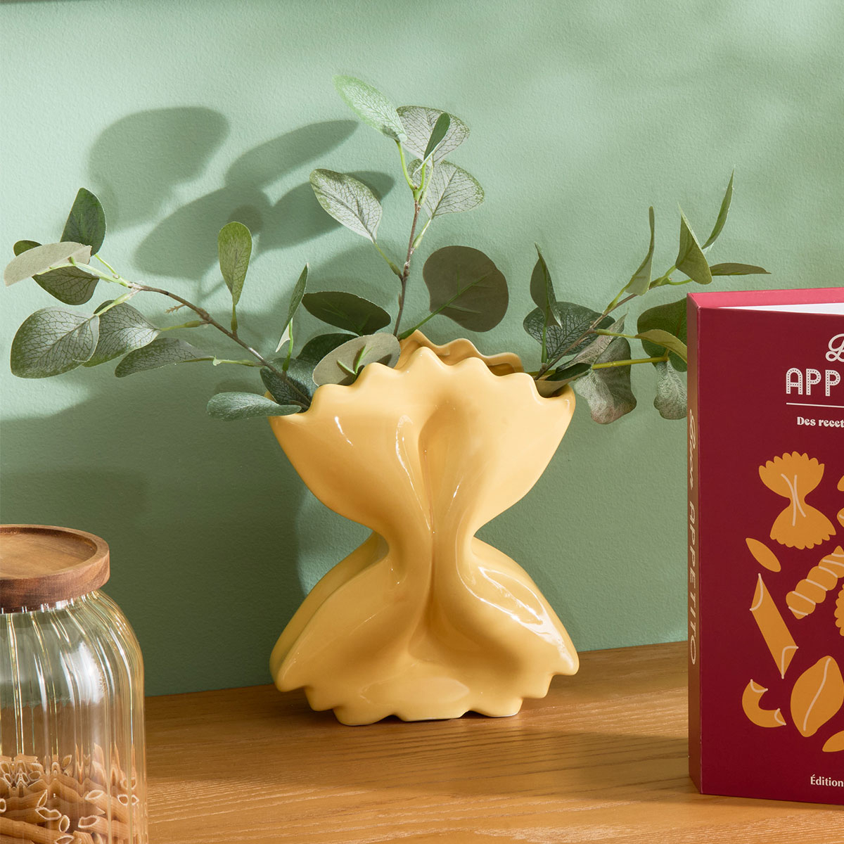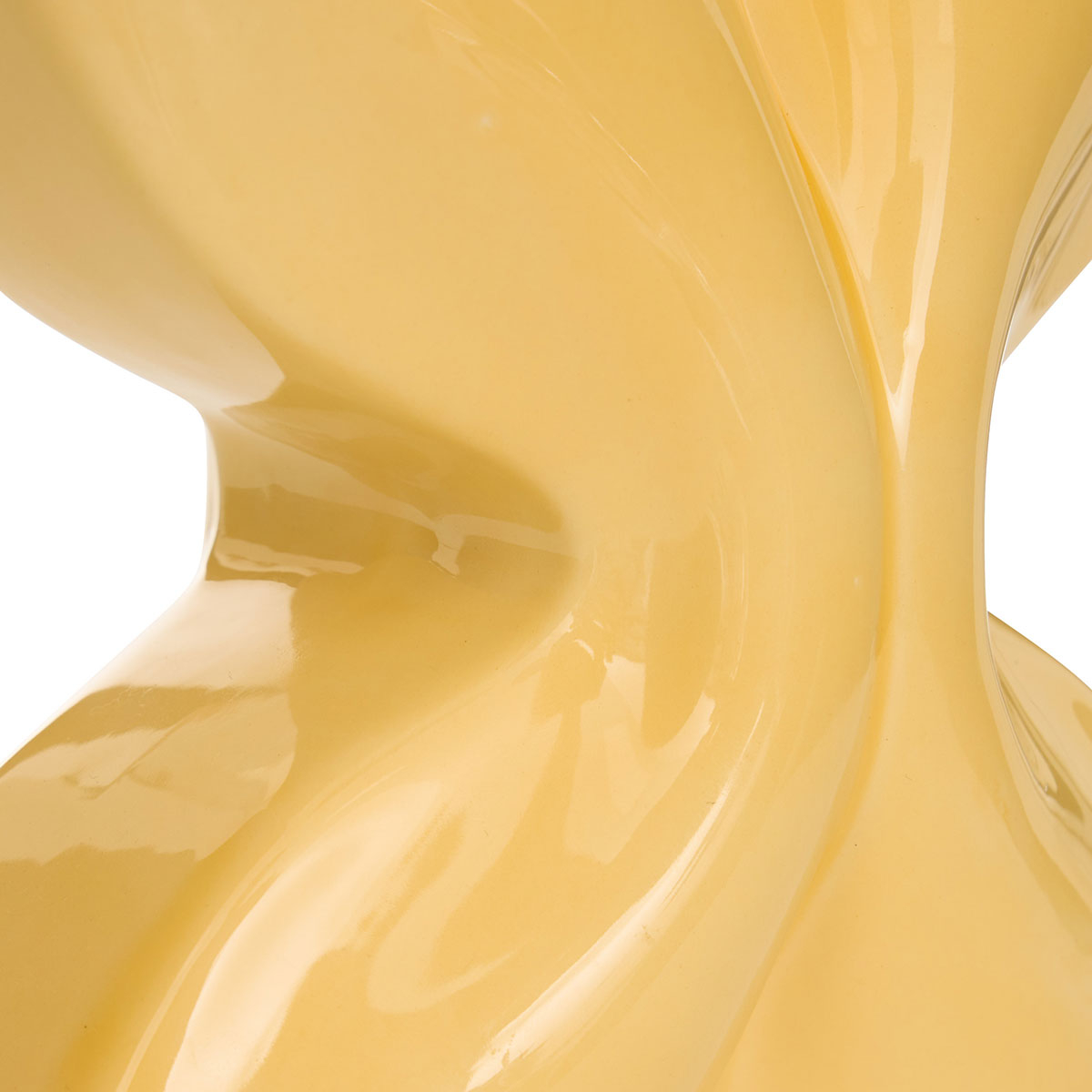 Βάζο διακόσμησης με μοντέρνα αισθητική και σχήμα μακαρονιού. Είναι κατασκευασμένο από κεραμικό υλικό σε κίτρινη απόχρωση. Ιδανικό για να τοποθετηθεί και να διακοσμήσει την τραπεζαρία ή την κουζίνα και να δώσει μια παιχνιδιάρικη πινελιά. Συνδυάστε το με τα υπόλοιπα είδη της ίδιας συλλογής για ένα ολοκληρωμένο αποτέλεσμα στο χώρο σας.