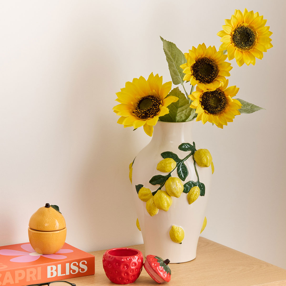 Διακοσμητικό βάζο με μοντέρνα αισθητική. Είναι κατασκευασμένο από κεραμικό υλικό σε λευκό χρώμα με ανάγλυφα κίτρινα λεμόνια και πράσινα φύλλα. Ιδανικό για να προσθέσει χρώμα και προσωπικότητα στο σαλόνι, την τραπεζαρία ή την κουζίνα, είτε χρησιμοποιηθεί μόνο του ως διακοσμητικό αντικείμενο είτε με αποξηραμένα ή τεχνητά λουλούδια. Συνδυάστε το με τα υπόλοιπα είδη της ίδιας συλλογής για ένα ολοκληρωμένο αποτέλεσμα στο χώρο σας.