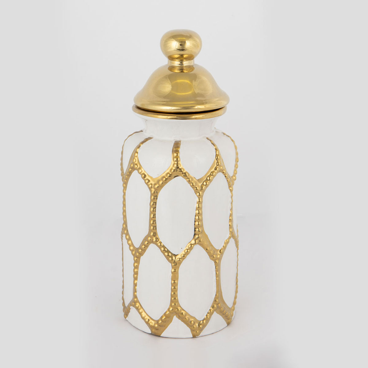 Διακοσμητικό δοχείο με καπάκι της εταιρείας Estheti σε λευκό-χρυσό χρώμα με μοντέρνο σχέδιο. Είναι κατασκευασμένο από κεραμικό υλικό. Τοποθετήστε το στο σαλόνι ή την τραπεζαρία και ταιριάξτε το με άλλα είδη διακόσμησης απ' το Spitishop για να φτιάξετε το σπίτι που πάντα ονειρευόσασταν.