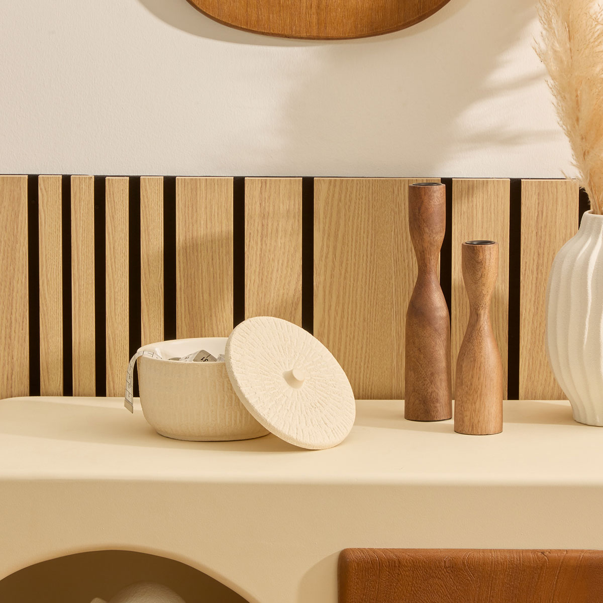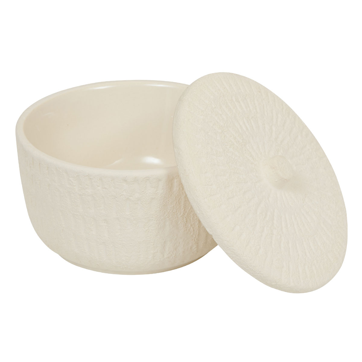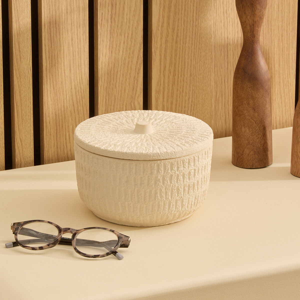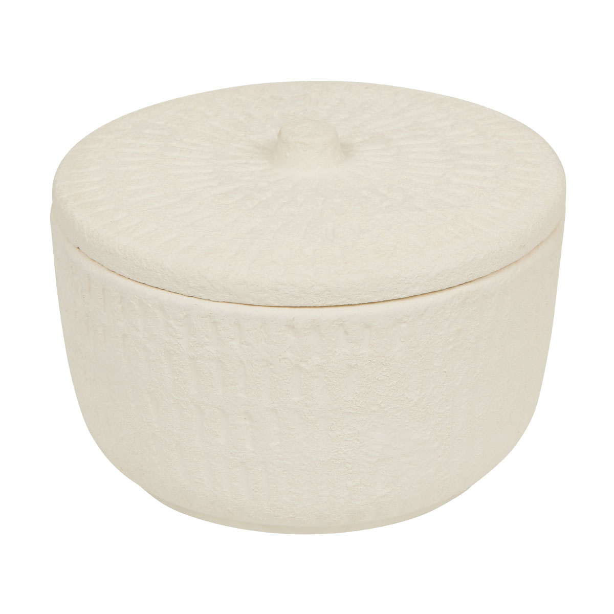 Διακοσμητικό δοχείο που θα χαρίσει μίνιμαλ ύφος στο χώρο σας. Είναι κατασκευασμένο από κεραμικό υλικό σε εκρού χρώμα με ανάγλυφη υφή και διαθέτει καπάκι. Χρησιμεύει και ως κουτί για κοσμήματα και αξεσουάρ. Συνδυάστε το με τα υπόλοιπα προϊόντα της ίδιας σειράς για ένα ολοκληρωμένο αποτέλεσμα στο χώρο σας.