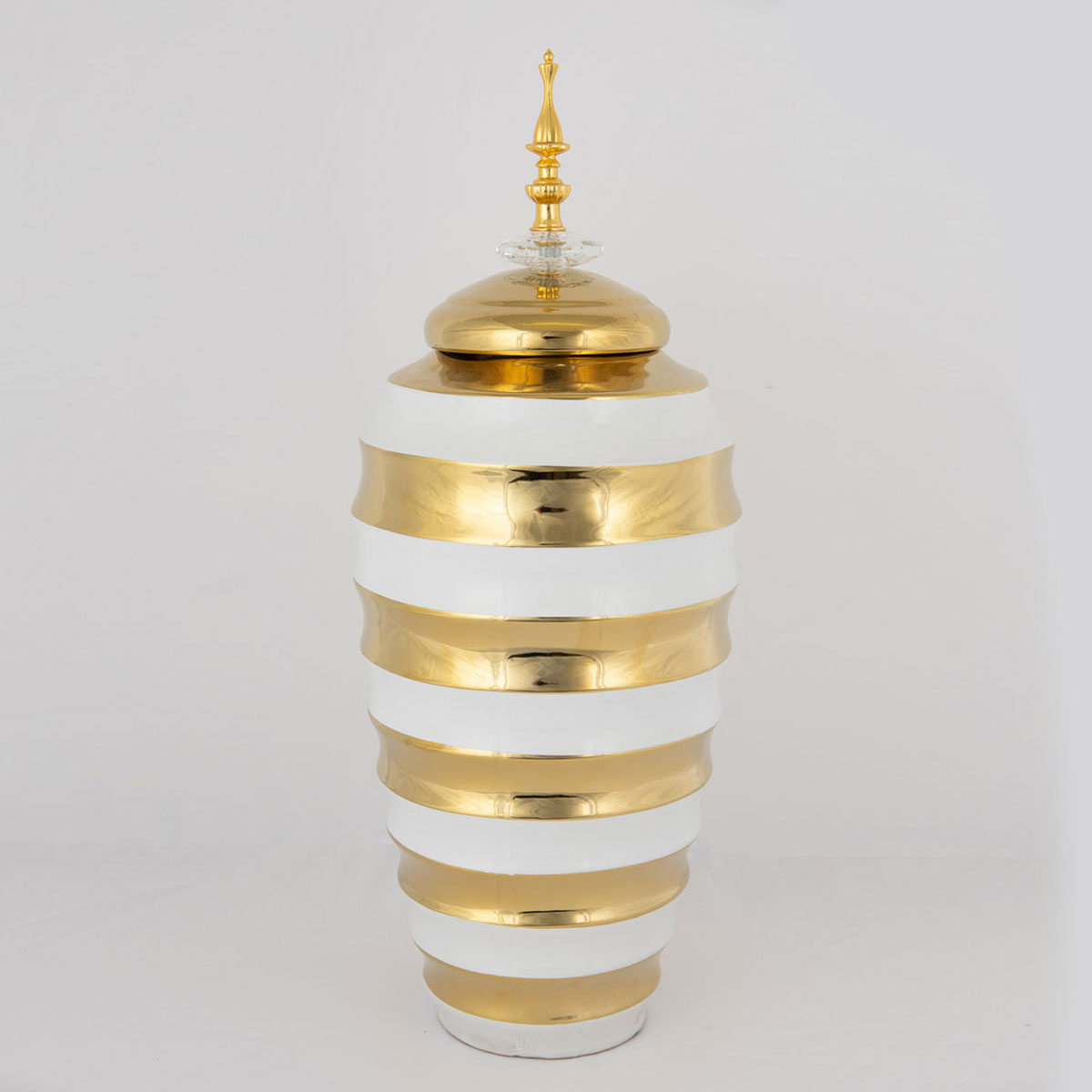 Διακοσμητικό δοχείο με καπάκι της εταιρείας Estheti σε λευκό-χρυσό χρώμα με μοντέρνο σχέδιο. Είναι κατασκευασμένο από κεραμικό υλικό. Τοποθετήστε το στο σαλόνι ή την τραπεζαρία και ταιριάξτε το με άλλα είδη διακόσμησης απ' το Spitishop για να φτιάξετε το σπίτι που πάντα ονειρευόσασταν.